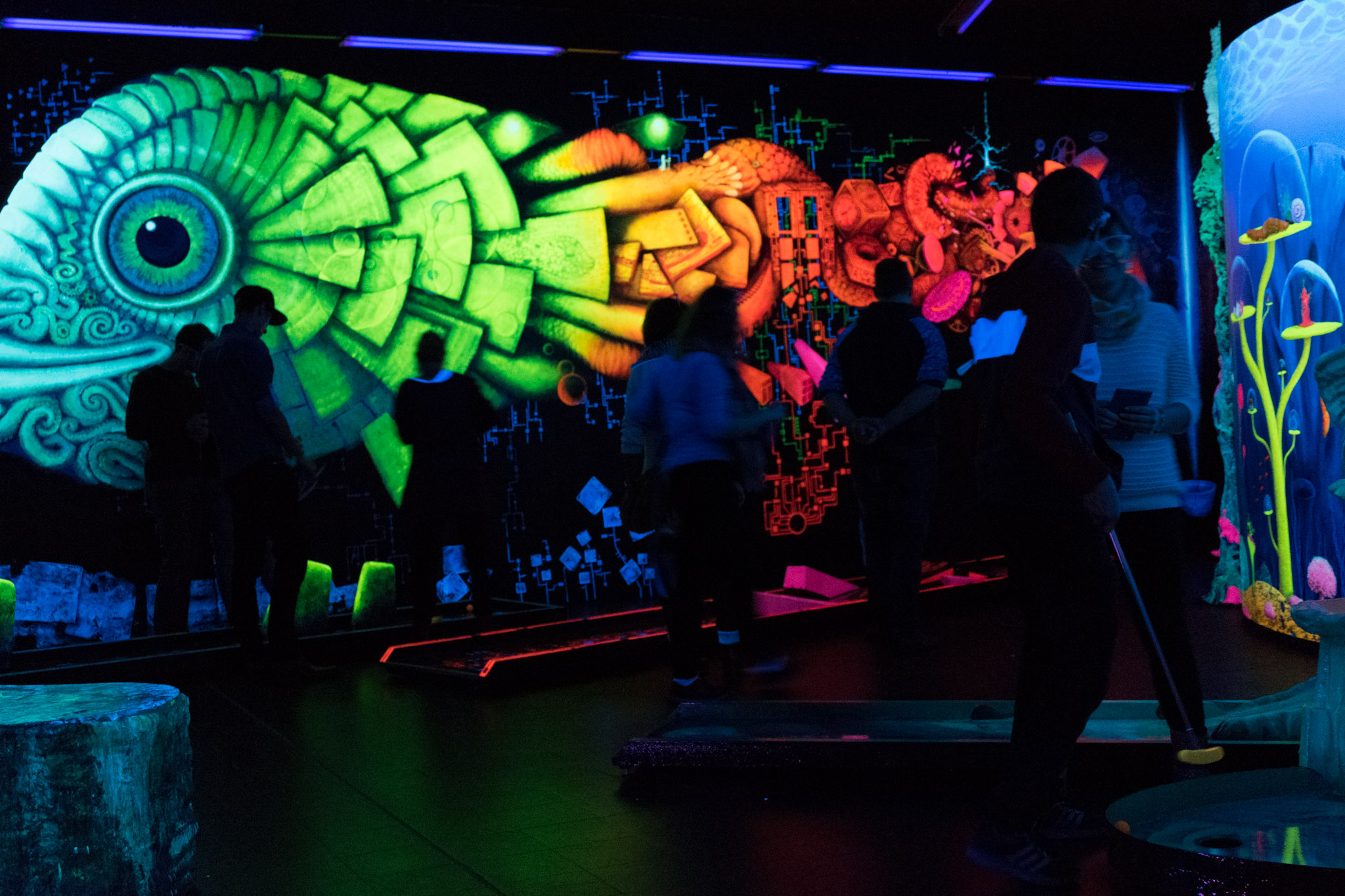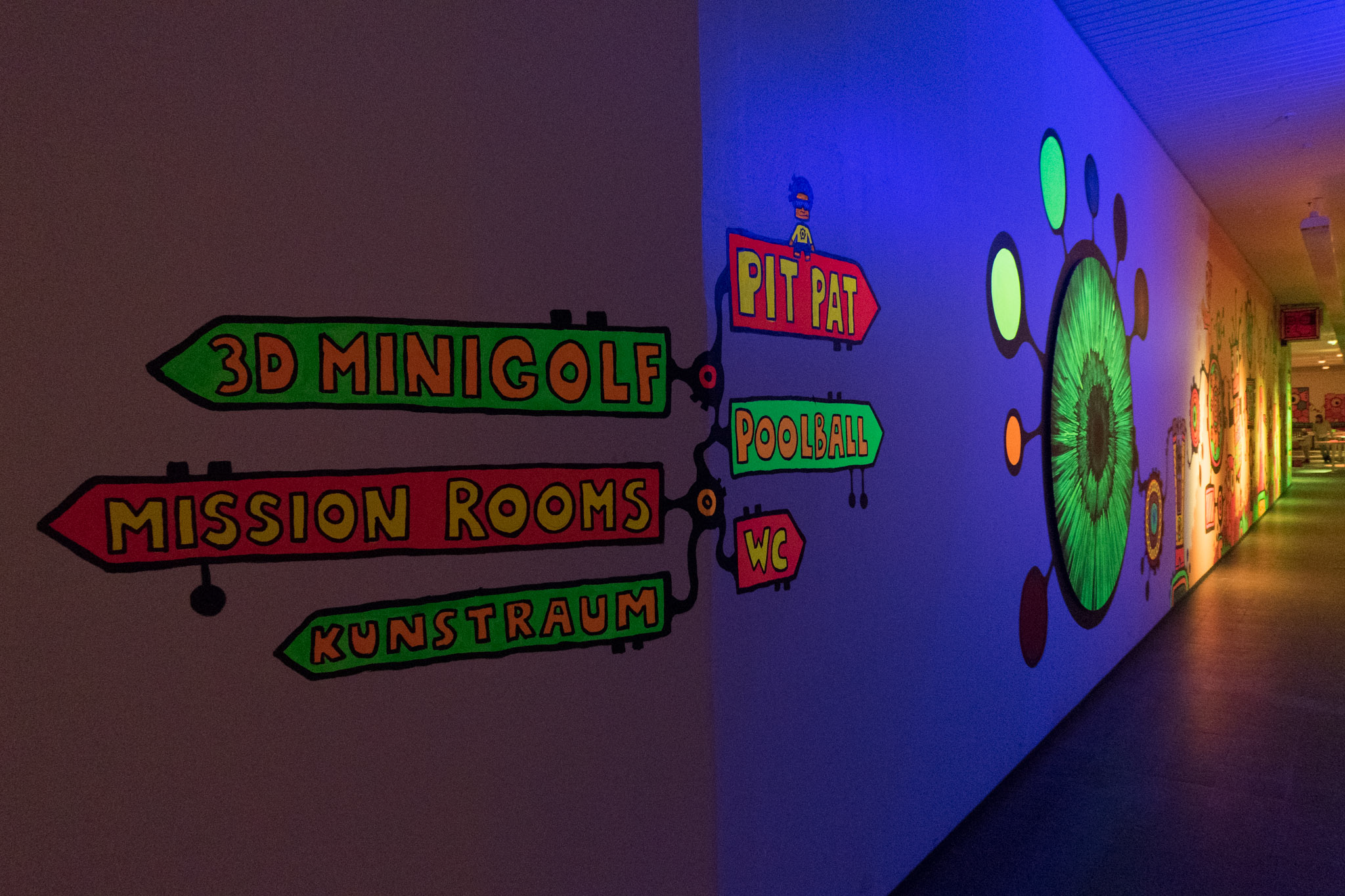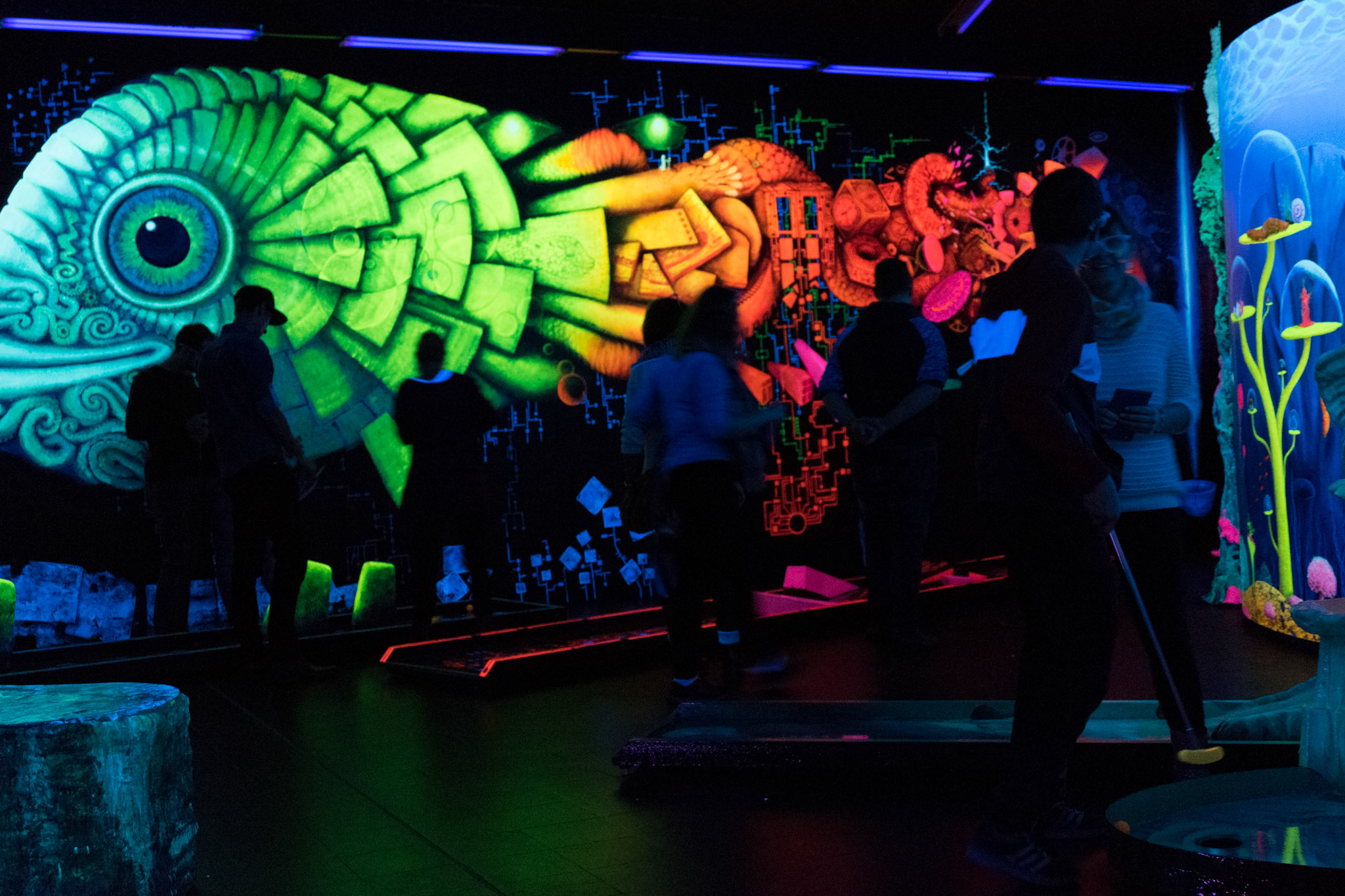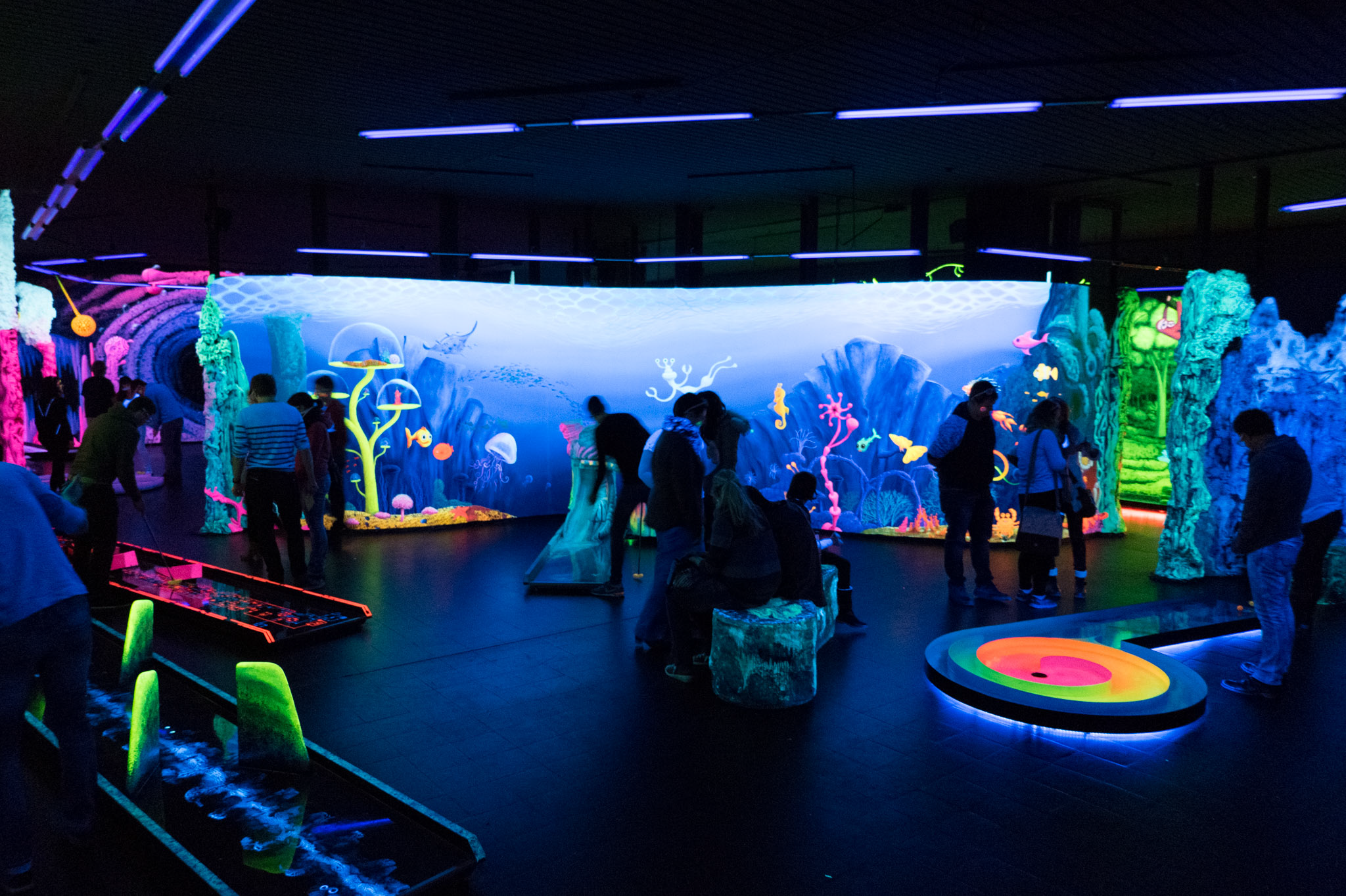 Ein in 3D-Technik handgemaltes, Gesamtkunstwerk begleitet euch auf durch den Schwarzlicht Minigolf Parcour mit 18 interaktiven Bahnen.