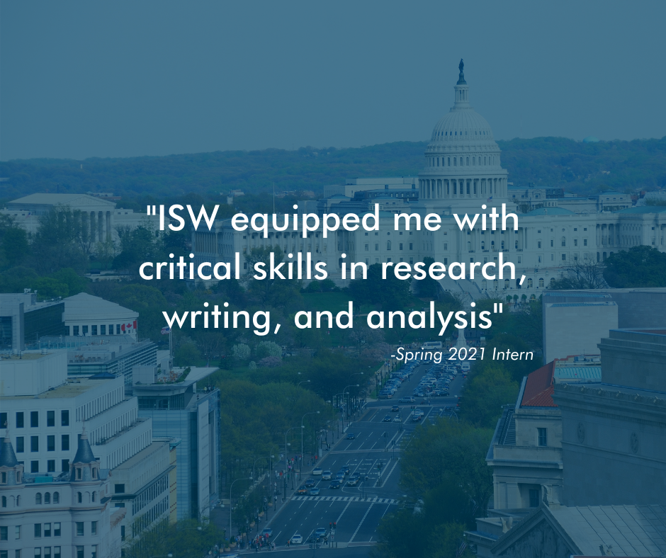 ISW is currently accepting internships for its Fall 2025 Internship Program. The program will run from September 9 to December 12, 2025. Applications will be reviewed on a rolling basis until July 25, 2025. Click on any of the following positions to learn more and apply.