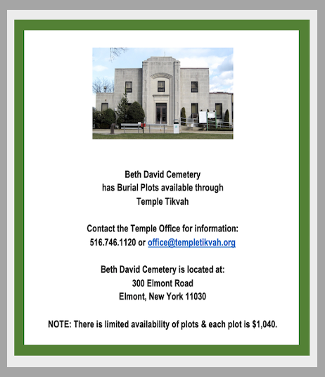 - TEMPLE TIKVAH MEMORIAL FUND: Deborah Abramowitz in memory of Sylvia & Daniel Lerner • Robert Bader in memory of Helen Bader, Emanuel Kramer, Jacob R. Kramer, Gussie Wexler, and Harold Bader • Marian & Seth Baskin in memory of Harry Baskin • Lorraine Bertan in memory of Lester Bertan and Celia Bertan • Betsy Jacobs Bivino in memory of Jacob Noll • Arnold & Sylvia Bloch in memory of Charles Margolis and Judson Schiebel • Bernice Bloch in memory of Charles Margolis • Arline & Jack Cazes in memory of Gerda Weissfeld • Terri Cohen in memory of Loretta Cohen • Andrea & Marc Comerchero in memory of Aaron Comerchero • Mindy & Mark Daniels in memory of Kay Jedlin • Elaine Farber in memory of Walter Roth • Merle Fishkin in memory of Brian Fishkin • Sharon Fricano in memory of Manfred Fink and Henry Fink • Marc & Michele Gold in memory of Norman Reiss (Reese) • Vivien Goldbaum in memory of Egon Biss • Stephen & Barbara Goldberg in memory of Samuel Goldberg • Larry & Terrie Goldstein in memory of Etta Goldstein • Mark & Lori Gordon in memory of Betty & Herman Gordon • Charles Hyman in memory of Iris Hyman and Sophie Hyman • Toby & Steve Israel in memory of Jules Beers • Robin & Robert Jacobson in memory of Lester Sarnoff and Jacob Jacobson • Judy & Joe Kirschner in memory of Rebecca Rosenberg, Bella Kirschner, and Gerda Weissfeld • Leslie Kizner in memory of Abraham Kizner • Patrice Kolomer in memory of Evelyn Lipchonsky • Gloria & Lawrence Konstan in memory of Gerda Weissfeld • Cheryle & Steve Levine in memory of Gerda Weissfeld • Estelle Magidson in memory of Goldie and Joseph Farber • Barbara & Joe Massey in memory Meyer Katz • Joyce & Joel Mensoff in memory of Gerda Weissfeld • Lee Newman in memory of Elsa Singer • Michael & Gigi Newman in memory of Manuel Gutierrez • Margery & Edward Orenstein in memory of Harry Friedman • Beverly Osrow in memory of Louis Kerbel • Karla Osuna in memory of Harry Brooks and Martha Steinberg • Lori & Don Panetta in memory of Al Freeman and Harry Schonener • Sandra & David Peskin in memory of Gerda Weissfeld • Steven Reisman in memory of Theresa Reisman and Harry Schechtman • Milton & Barbara Rosenberg in memory of Henry Rosenberg • Susan Schall in memory of Harvey Wald, Gerda Weissfeld, and Thelma Schreibman • June & Jack Schwarz in memory of Molly Birenbaum/Weiner • Barbara Silberman in memory of Samuel Kellner • Janet & Barry Spool in memory of Nathan Kaplan and Geraldine Spool • Saul Teichberg in memory of Lillian Teichberg • Neela & Ken Weber in memory of Sidney Weber • Joan Wiener in memory of Irving Kolman
