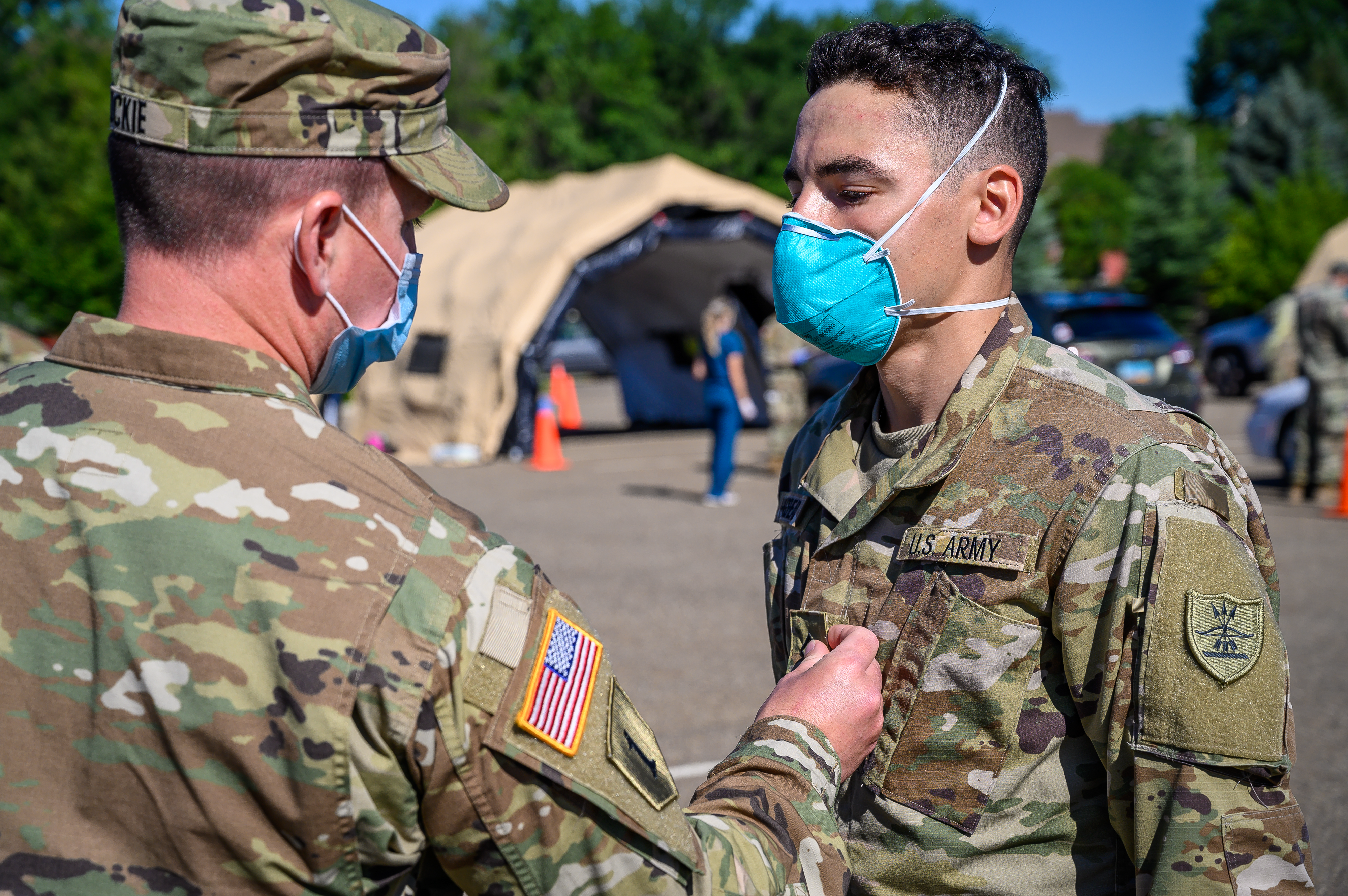Capt. Eric Stockie promotes Nathan Hollingshead to Private First Class at a surprise promotion ceremony during COVID-19 testing mission at the N.D. State Capitol in Bismarck on July 1. Both Soldiers are assigned to 1st Battalion, 188th Air Defense Artillery Regiment.