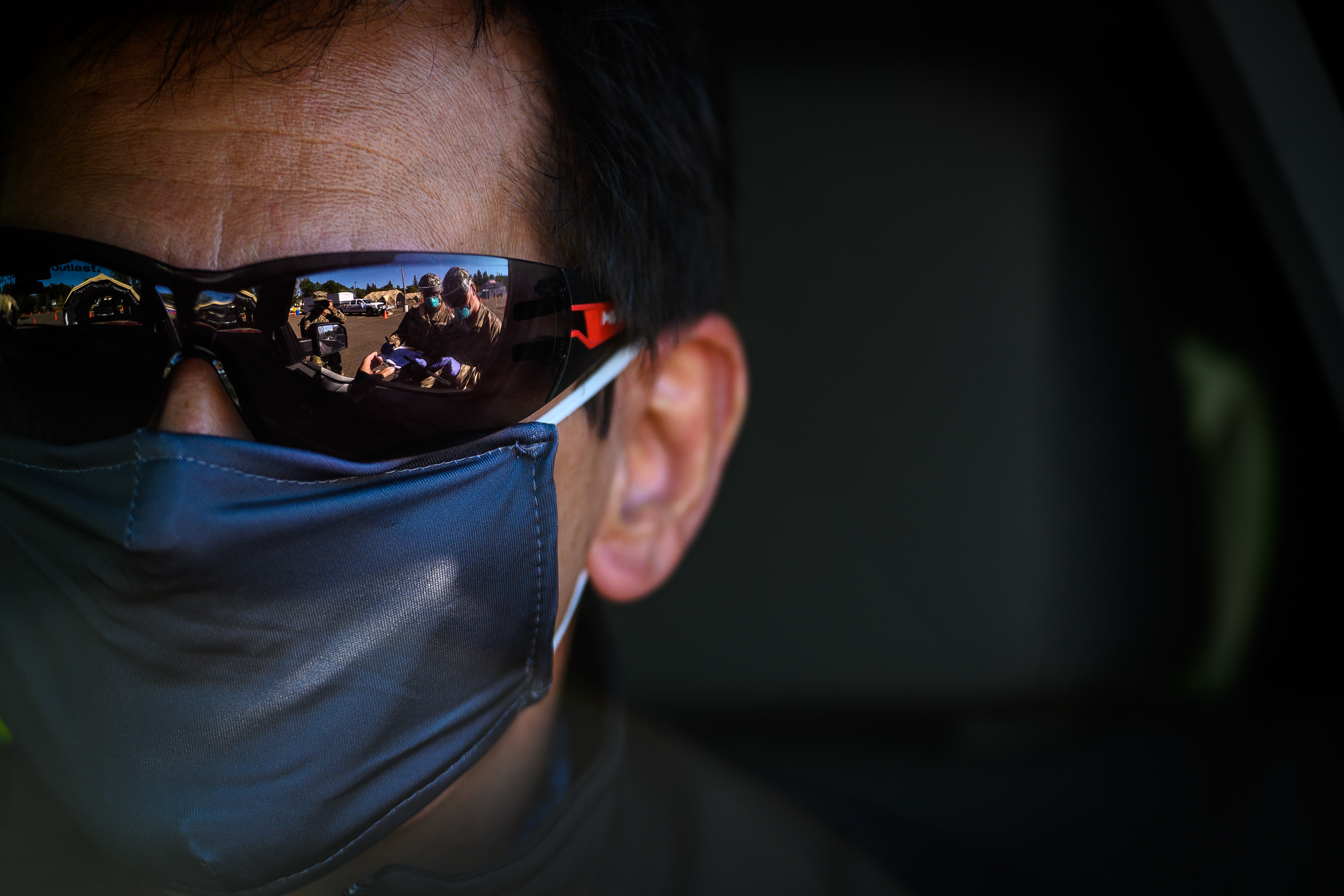 N.D. Guard data collectors are reflected in a COVID-19 test participant's sunglasses at the N.D. State Capitol on July 1.