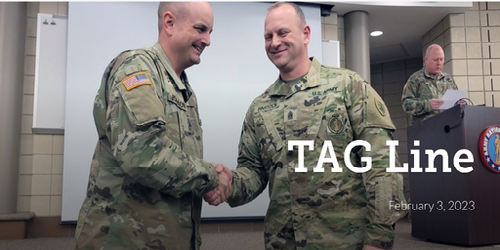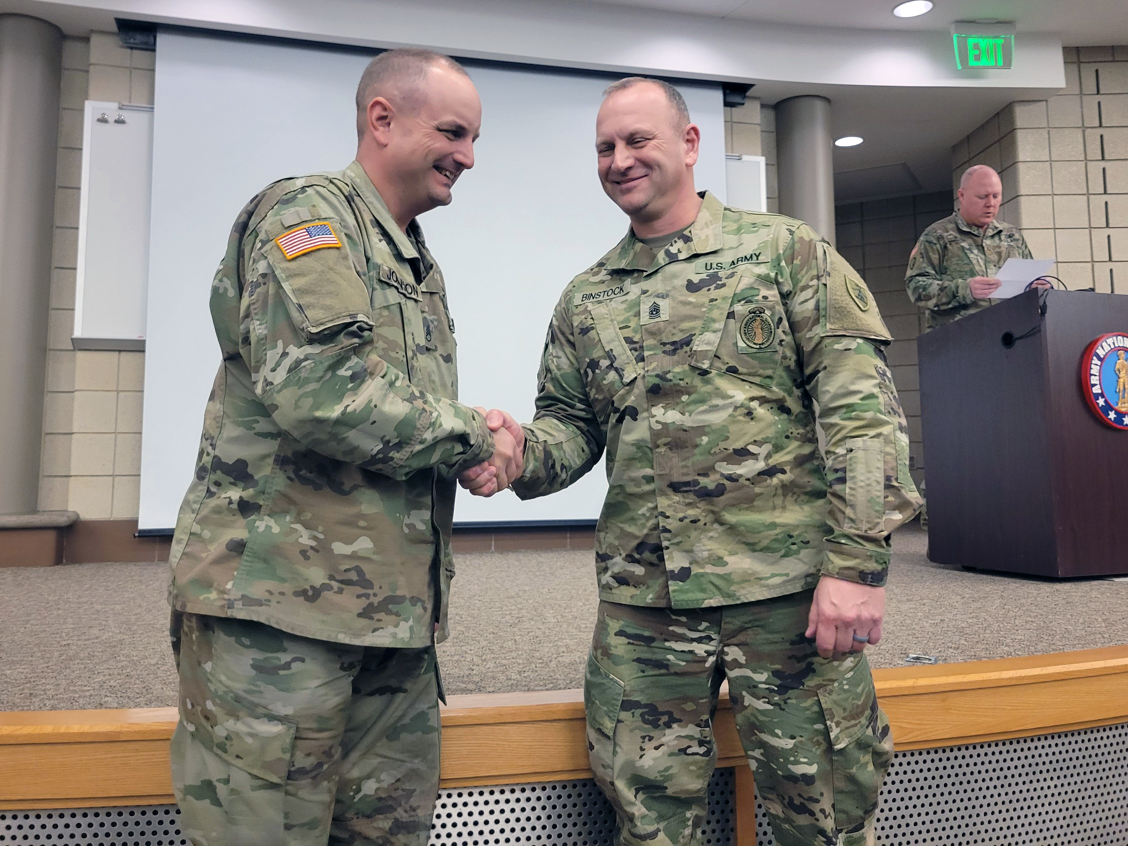 Top photo: Command Sgt. Maj. Eric Binstock, N.D. National Guard state command sergeant major, presents a coin to Staff Sgt. Nathan Johnson, 188th Army Band, for receiving a score of 94% on the Command Maintenance Discipline Program as the supply and readiness noncommissioned officer, Camp Grafton Training Center, Jan. 27, 2023.