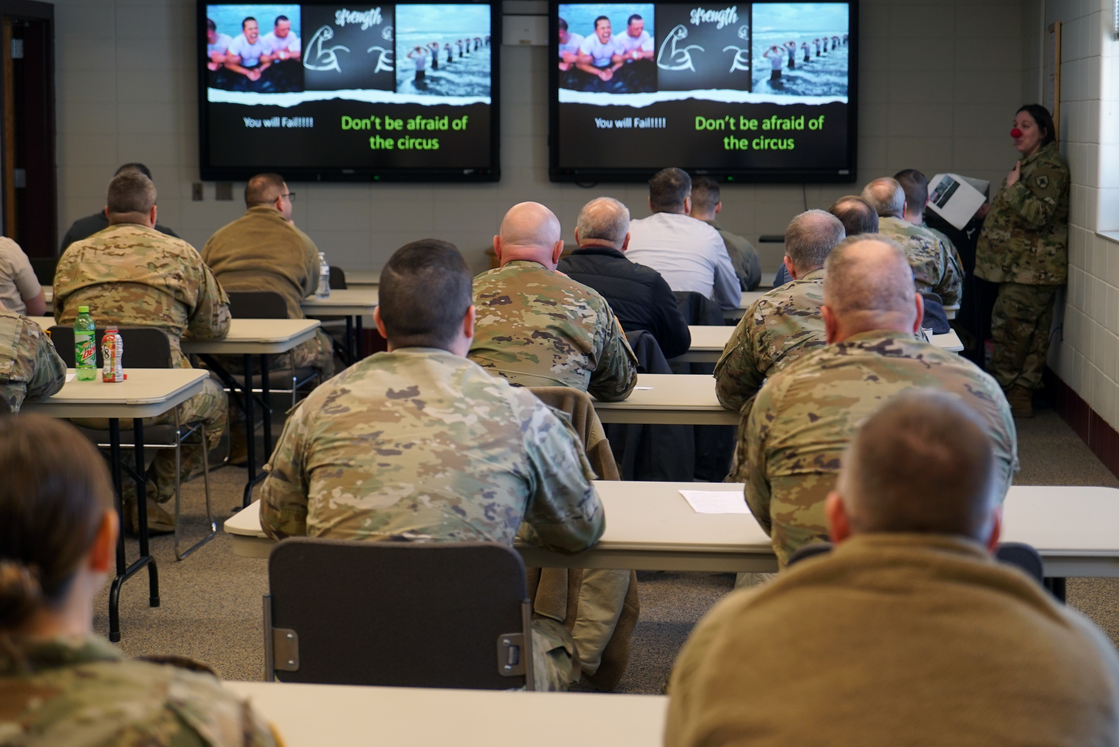 Mr. Robert Roehrich, N.D. National Guard equal opportunity manager, and Maj. Rachael Berg, N.D. National Guard employee labor relations, presented an engaging and informative presentation on "Don't be Afraid of the Circus", Fraine Barracks, Bismarck, N.D., Jan. 30, 2023. (National Guard story and photos by Sgt. 1st Class Charles Highland, N.D. National Guard Public Affairs Office)