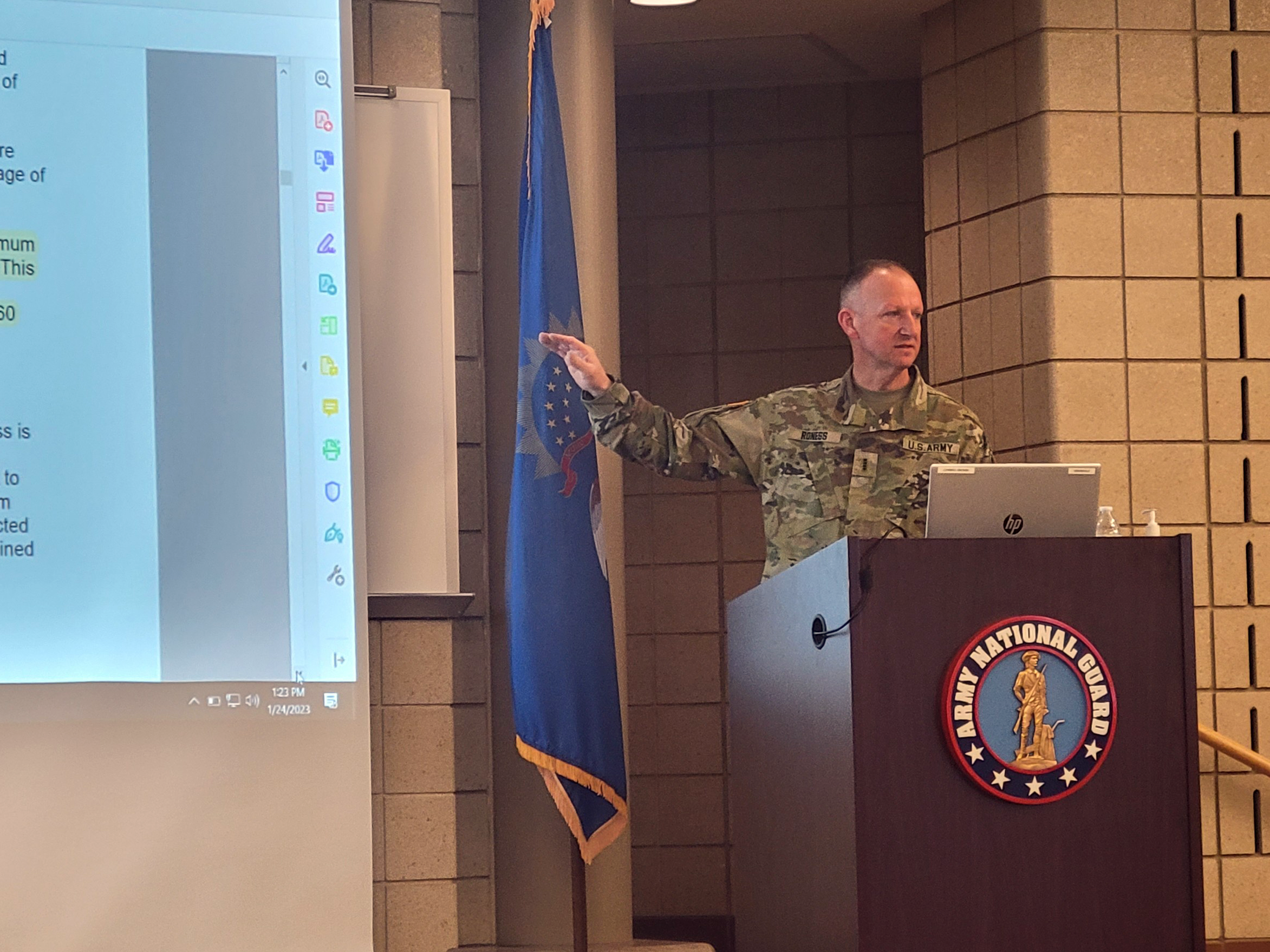 Chief Warrant Officer 4 Galen Roness, G4 technical operations branch, discusses responsibilities of the Surface Maintenance Manager Office at the N.D. Army National Guard Logistics Workshop, Camp Grafton Training Center, Jan. 26, 2023.