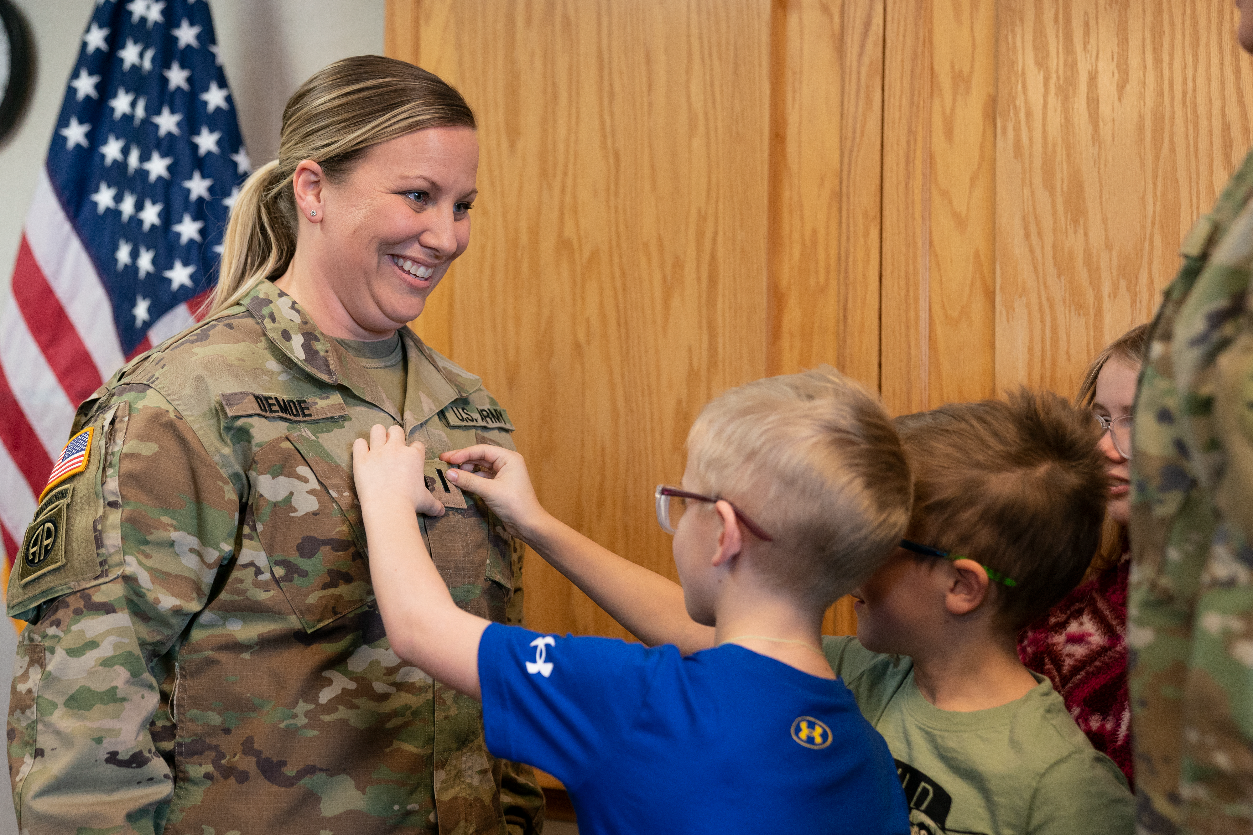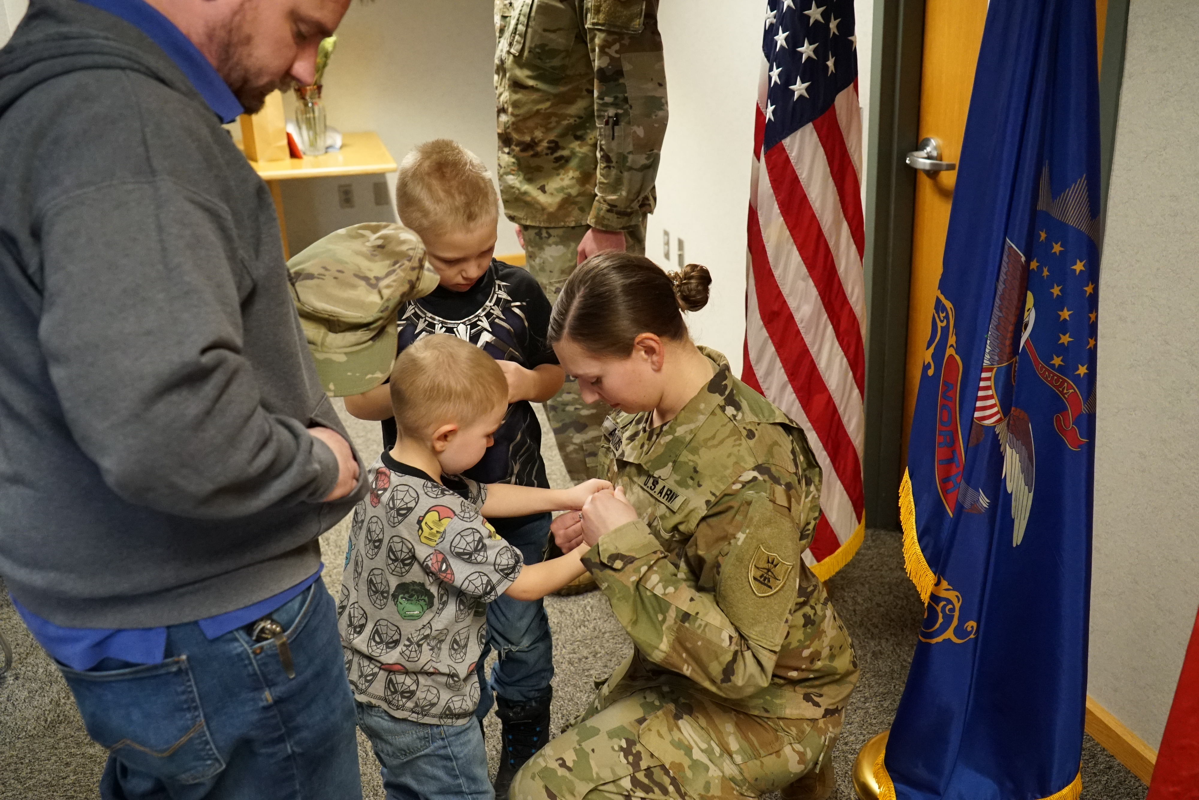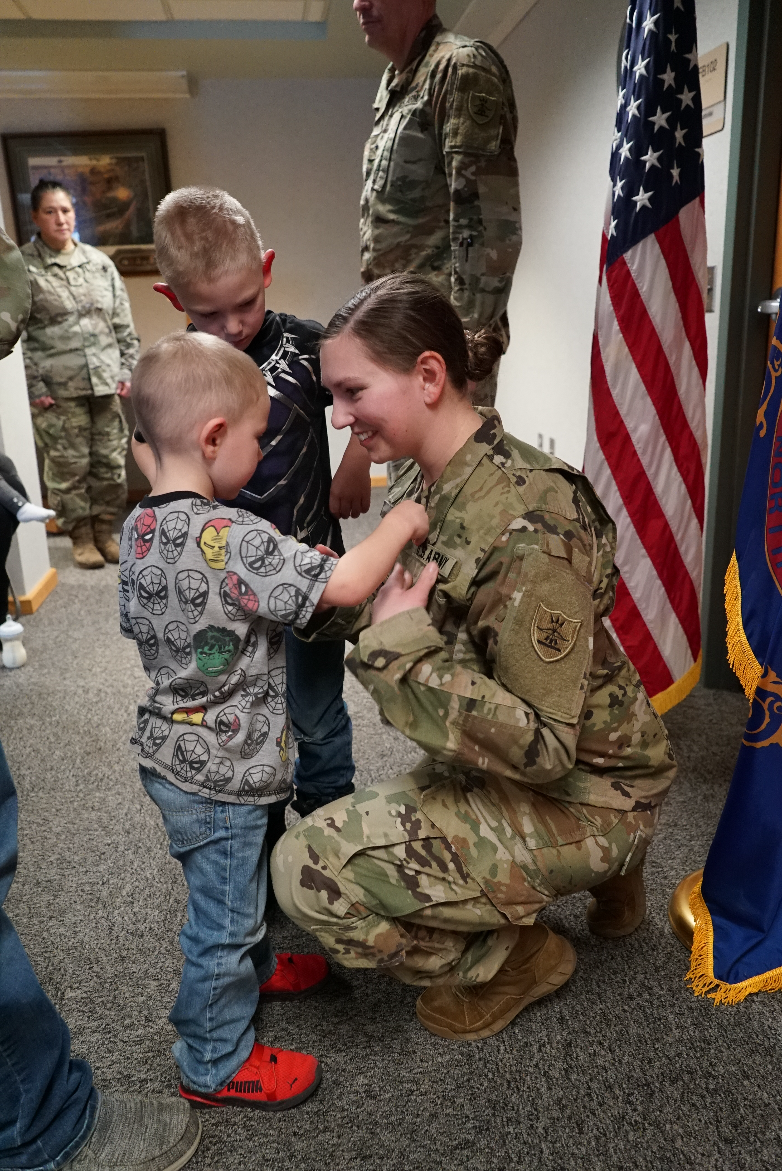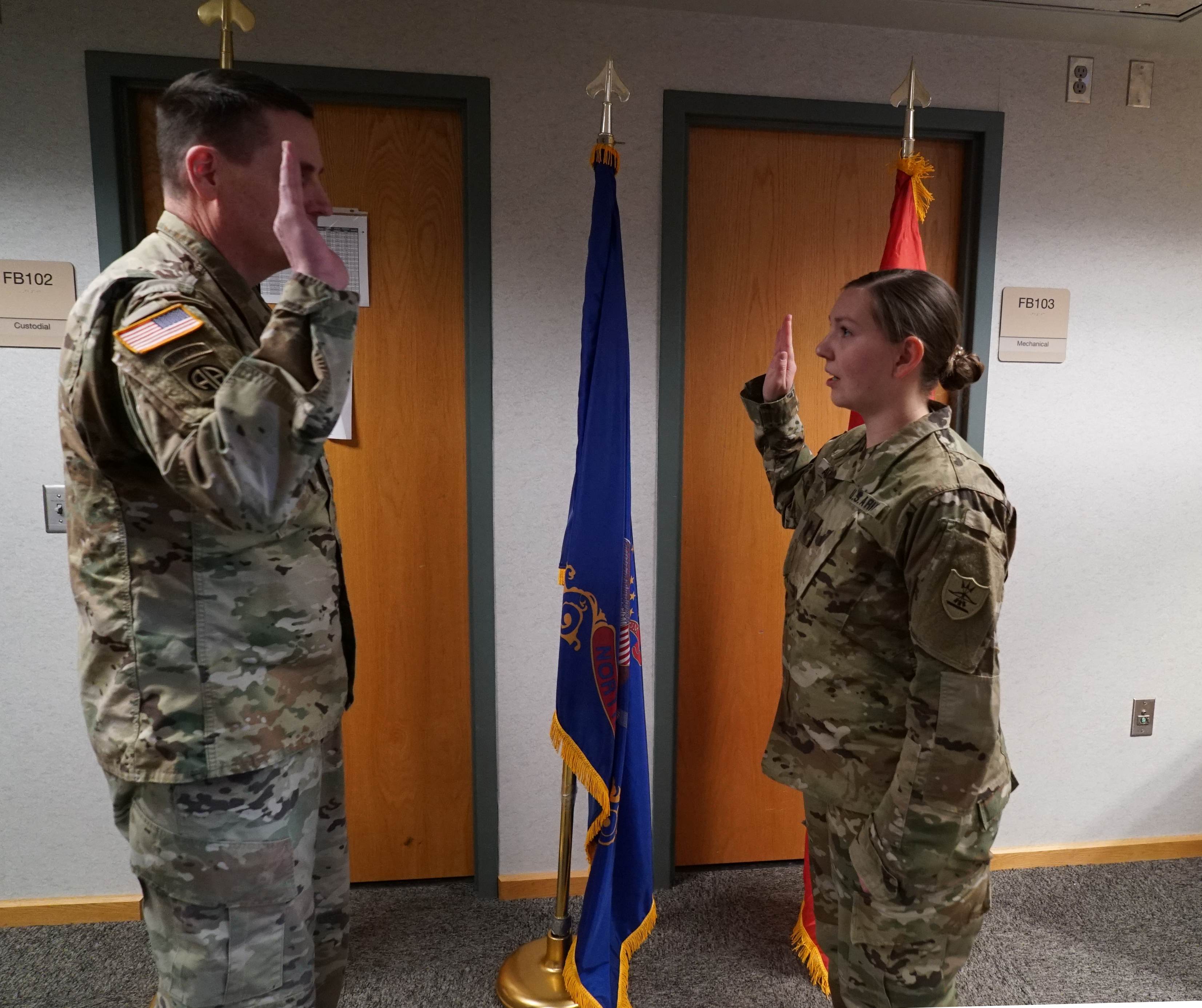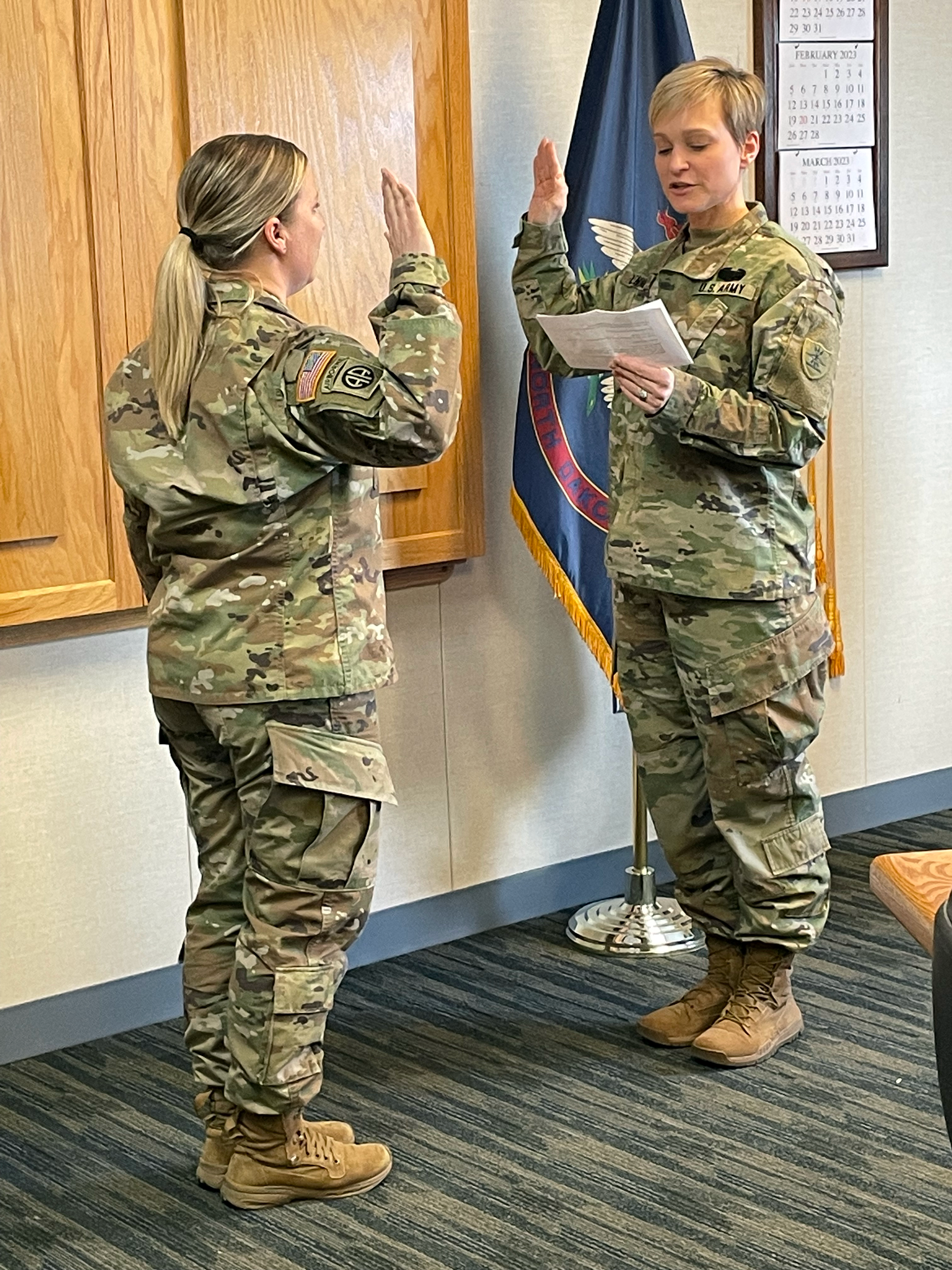 Capt. Vanessa Lennick, commander, N.D. Army National Guard Medical Detachment, presided over the promotion of Erin Demoe, commander, 116th Public Affairs Detachment, to first lieutenant, Raymond J. Bohn armory, Bismarck, Feb. 1, 2023. (National Guard story and photos by Staff Sgt. Sam Kroll, N.D. National Guard Visual Information)