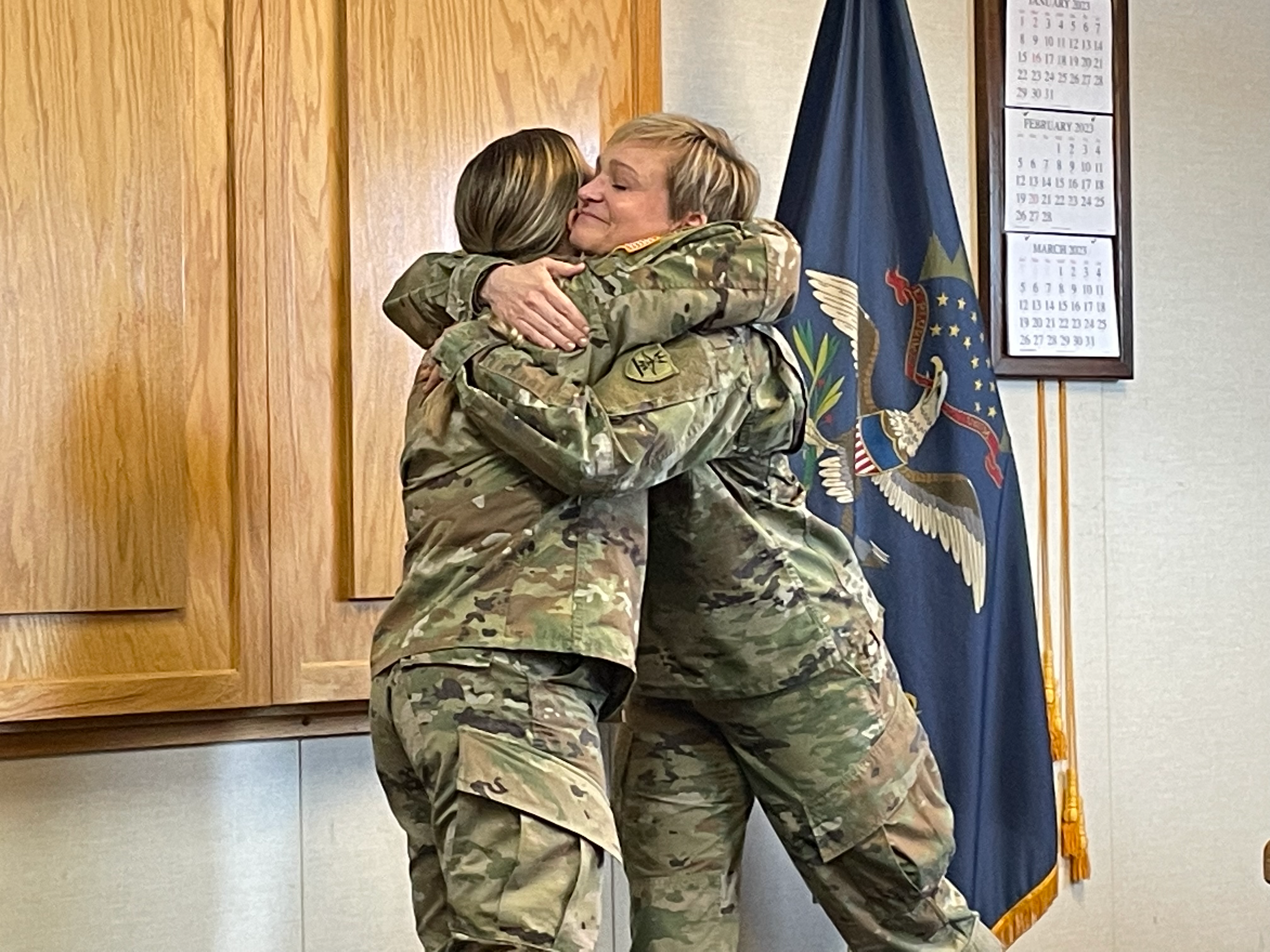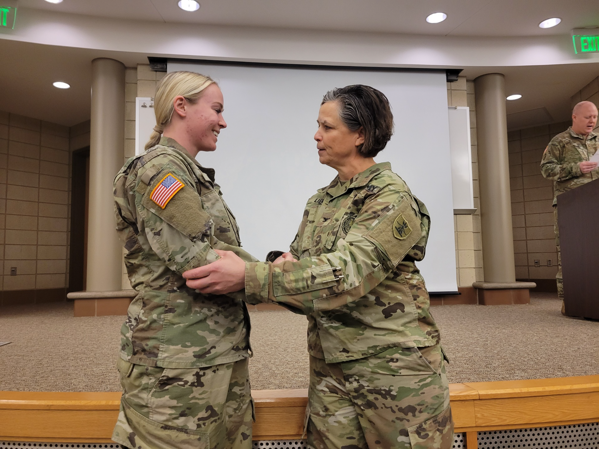 Col. Debra Lien, right, chief of staff, N.D. National Guard Army Component Command, presents a coin to Master Sgt. Amanda Phillips, 68th Troop Command, S4 non-commissioned officer in charge, for successfully operating without the normally assigned program analyst and S4 officer, Camp Grafton Training Center, Jan. 27, 2023.