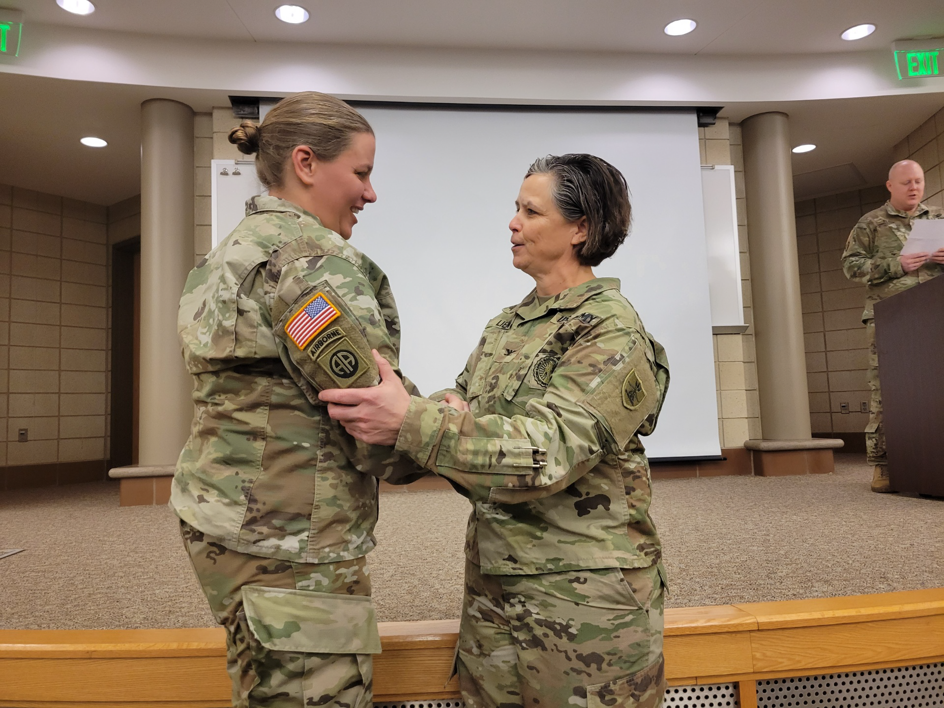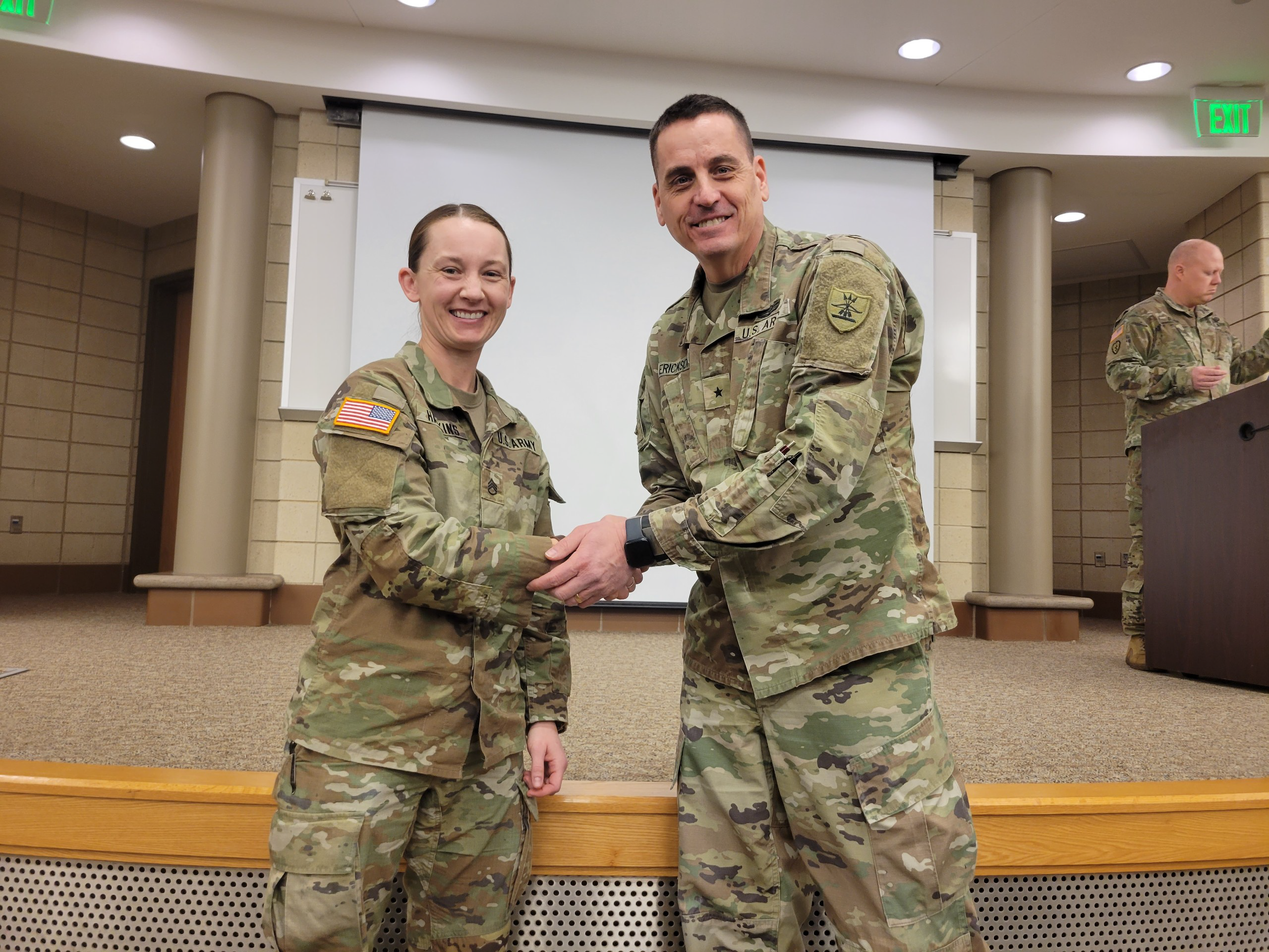 Brig. Gen. Jon Erickson, left, commander, N.D. National Guard Army Component Command, presents a coin to Staff Sgt. Kacey Hawkins, 142nd Engineer Battalion, for receiving a 100% and scoring the highest on the Command Maintenance Discipline Program as the supply NCO at Camp Grafton Training Center, Jan. 27, 2023.