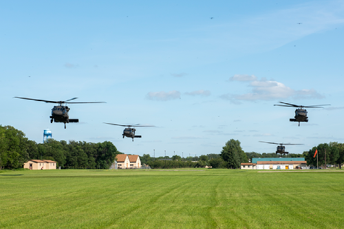 Four Black Hawk helicopters lift off from Camp Grafton Training Center, Devils Lake, July 17. The aircraft transported N.D. state legislators and business leaders from across the state of North Dakota participating in Civic Leader Day activities. (National Guard photo by Mr. Nathan Rivard, N.D. National Guard Public Affairs Office)
