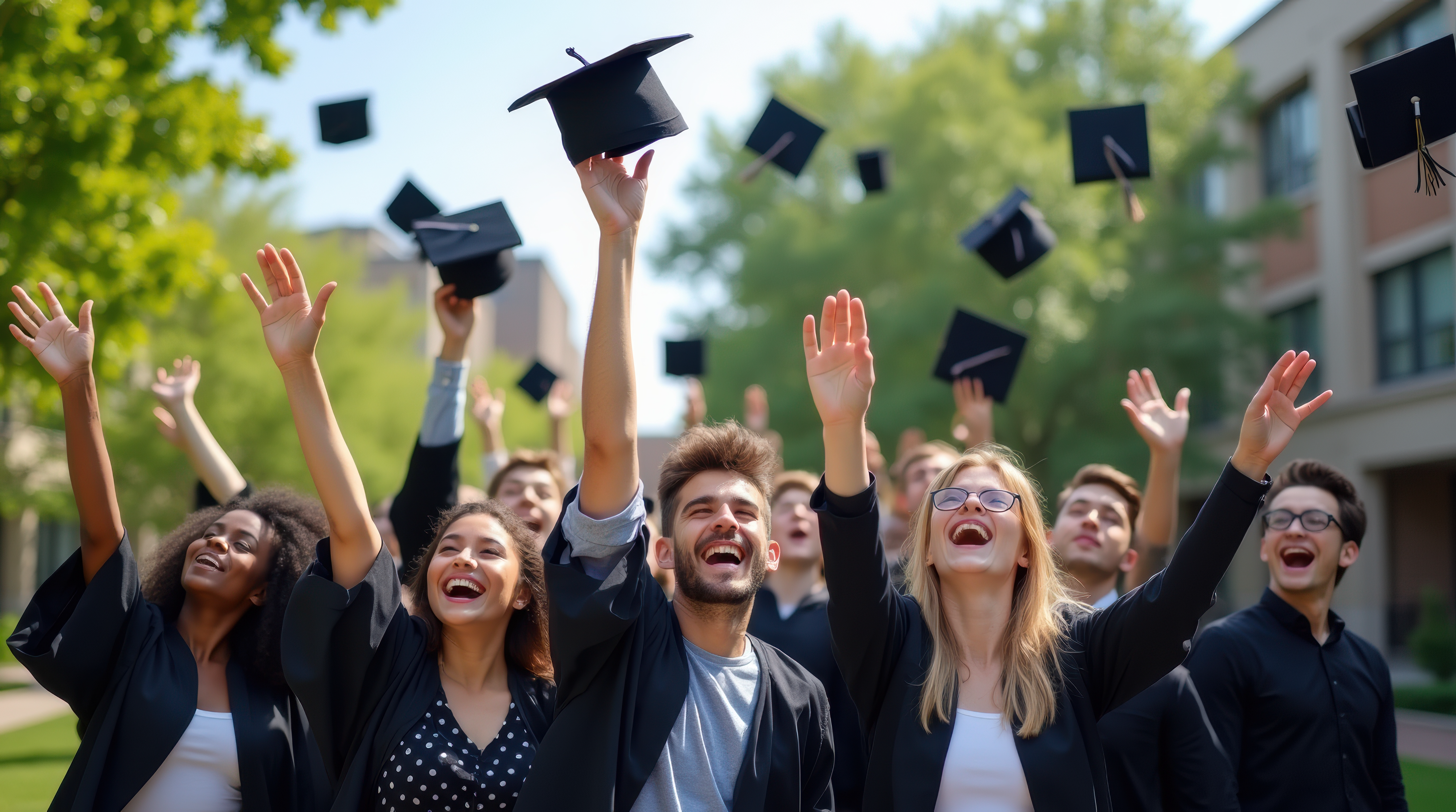 Created with images by Alex Pios - "Group of diverse students celebrating by throwing their caps in the air during a university graduation, outdoors, with trees and buildings in the background." • Looker_Studio - "Artificial intelligence concept with AI agents and data analytics dashboard.,Man working on laptop with futuristic interface for big data, machine learning, automation, and innovation." • Thomas - "light bulb with brain design creativity ideas modern thinking and critical thinking related concept" • Seak - "Student with a focused and resilient attitude, studying diligently at a desk surrounded by books and notes" • YouraPechkin - "Innovative medical technology allows detailed visualization of heart anatomy by a researcher" • eranicle - "Photo collage made of diverse world travel destinations" • peopleimages.com - "Theres a lot going on in the world currently.,Cropped shot of a group of young people protesting in the city." • Tierney - "Searching new job theme with person using a laptop on a white table"
