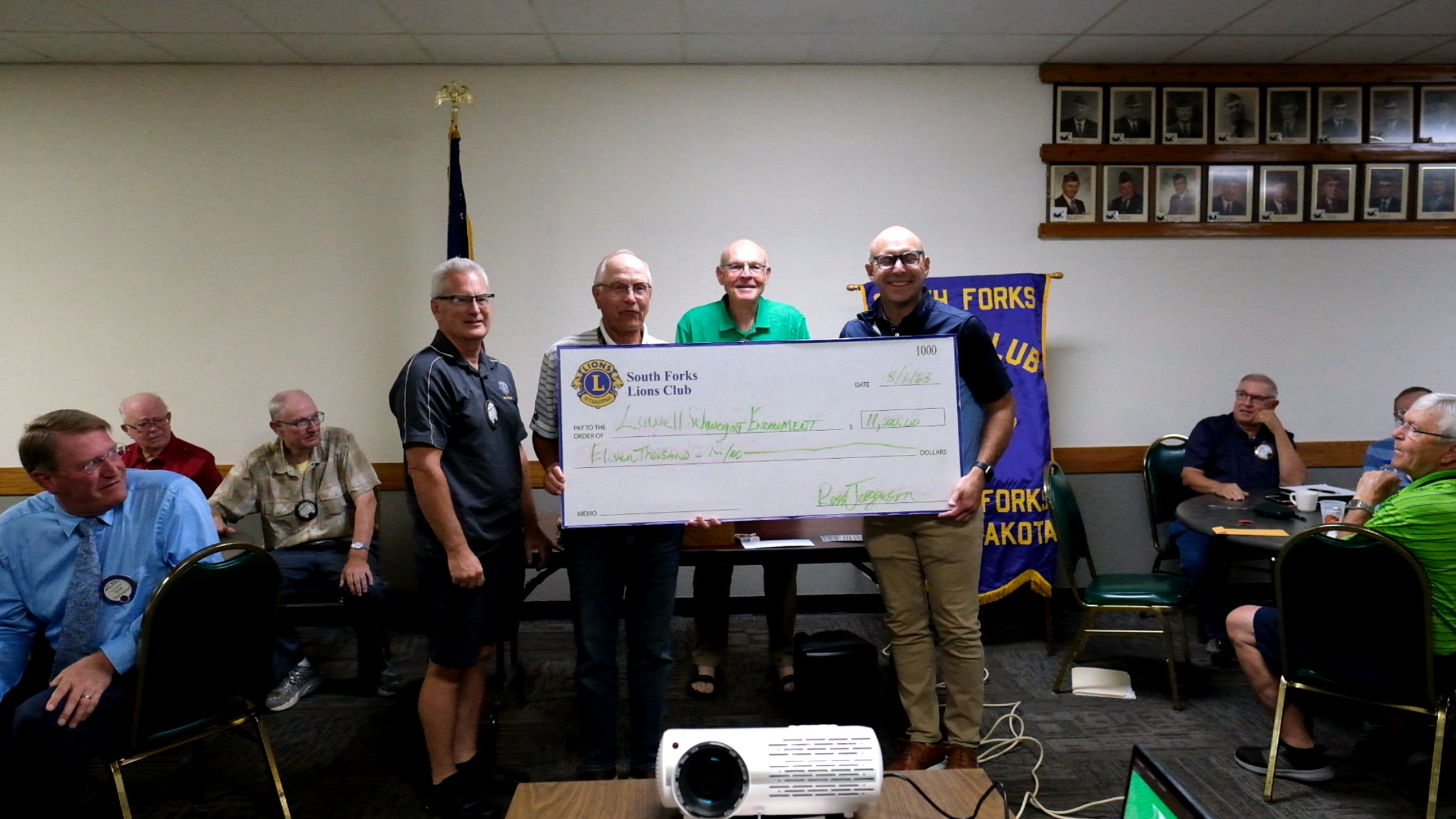 Tim Belmore of UND accepts an $11,000 check from the Grand Forks South Forks Lions at a recent club meeting. The money was raised from the 3rd annual Lions on the Links golf scramble held at Kings Walk Golf Course in Grand Forks. The money goes to the Lowell Schweigert Endowment fund, a fund specifically set up in recognition of former, now deceased member, Lowell Schweigert. The golf event has seen tremendous support, selling out quickly all 3 years. Approximately $30,000 has been contributed to the endowment from this event. The overall endowment has now grown to $90,000. Funds are used to support a UND football player. Lowell's brother, Kyle "Bubba" is UND's Head Football coach.