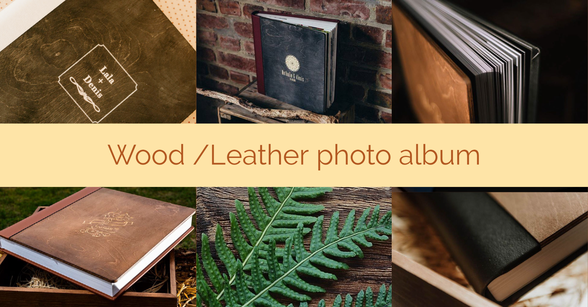 1) Photo album 35x35 cm, 24 spreads, genuine leather, wood cover, velvet luxury print paper, tracing paper, plaque / UV print on the cover