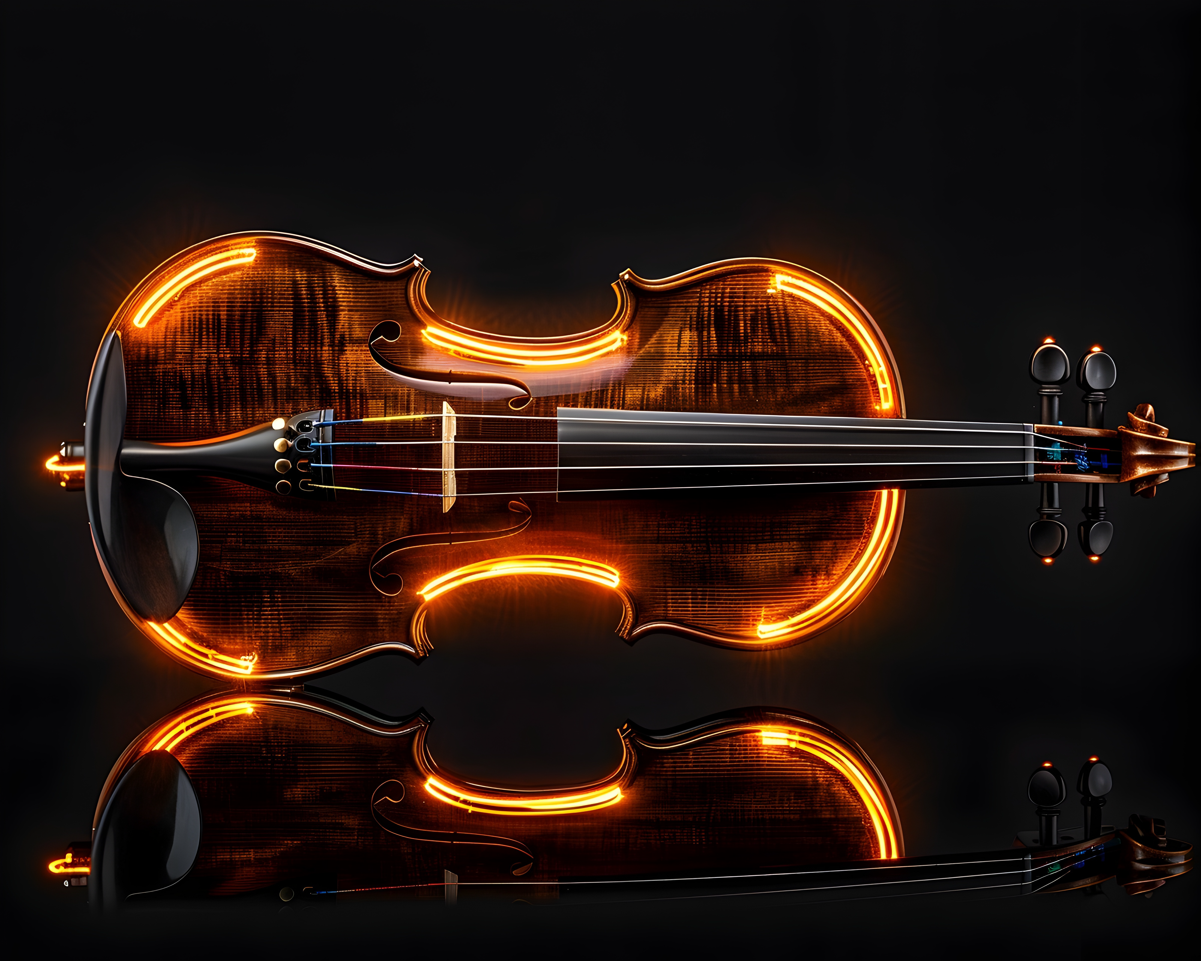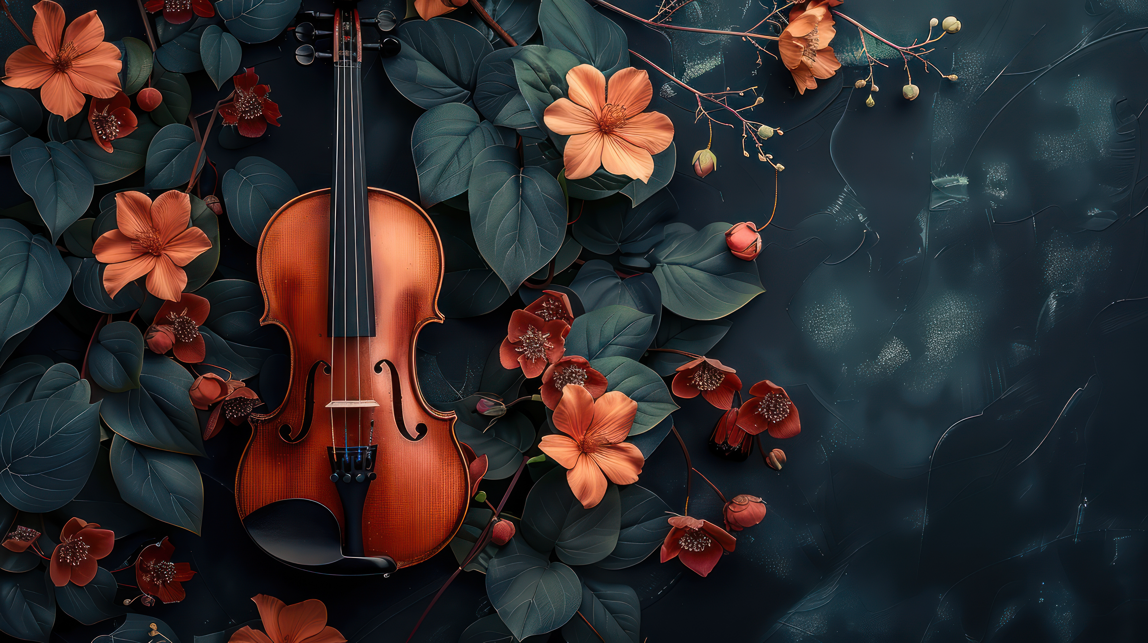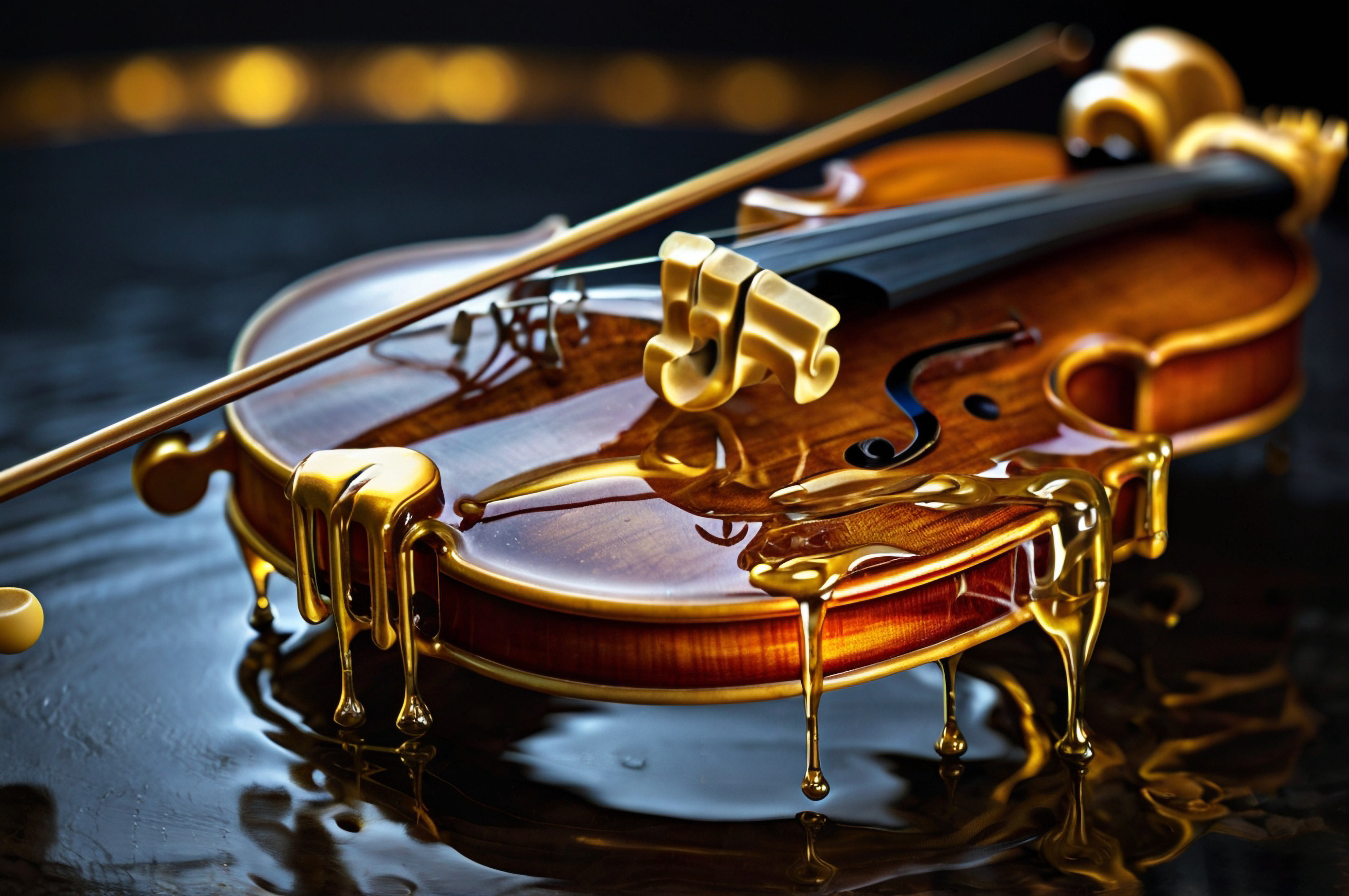 Created with images by warunthorn - "Abstract Violin Art." • Thares2020 - "Illuminating Electric Violin with Flowing Currents in Sleek Modern Design" • ZackZephyr - "Violin with Golden Liquid Splashes" • Alex - "A violin made of crystal suspended in mid-air. Classical music background concept. " • hisilly - "Melodic Blooms: Violin and Flowers on a Dark Background for Music Poster Design"