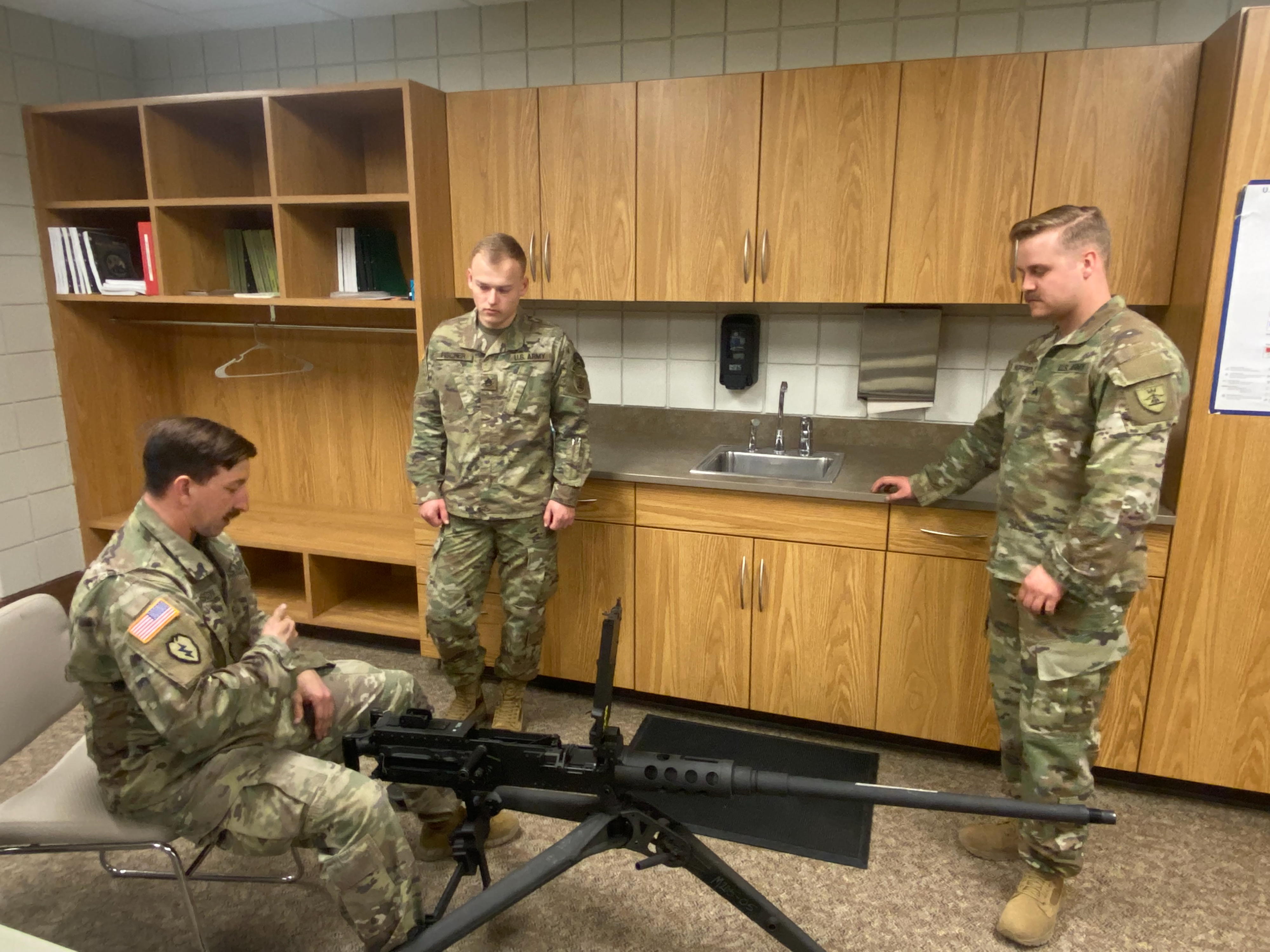 Sgt. 1st Class Corey Donaldson, 164th Regional Training Institute, left, and Sgt. Adelard Hoffarth, right, instruct Staff Sgt. Zachary Fischer, 188th Army Band, on the basics of disassembly, reassembly, functions checks, and troubleshooting for a variety of weapon systems at Camp Grafton Training Center, April 10, 2022.