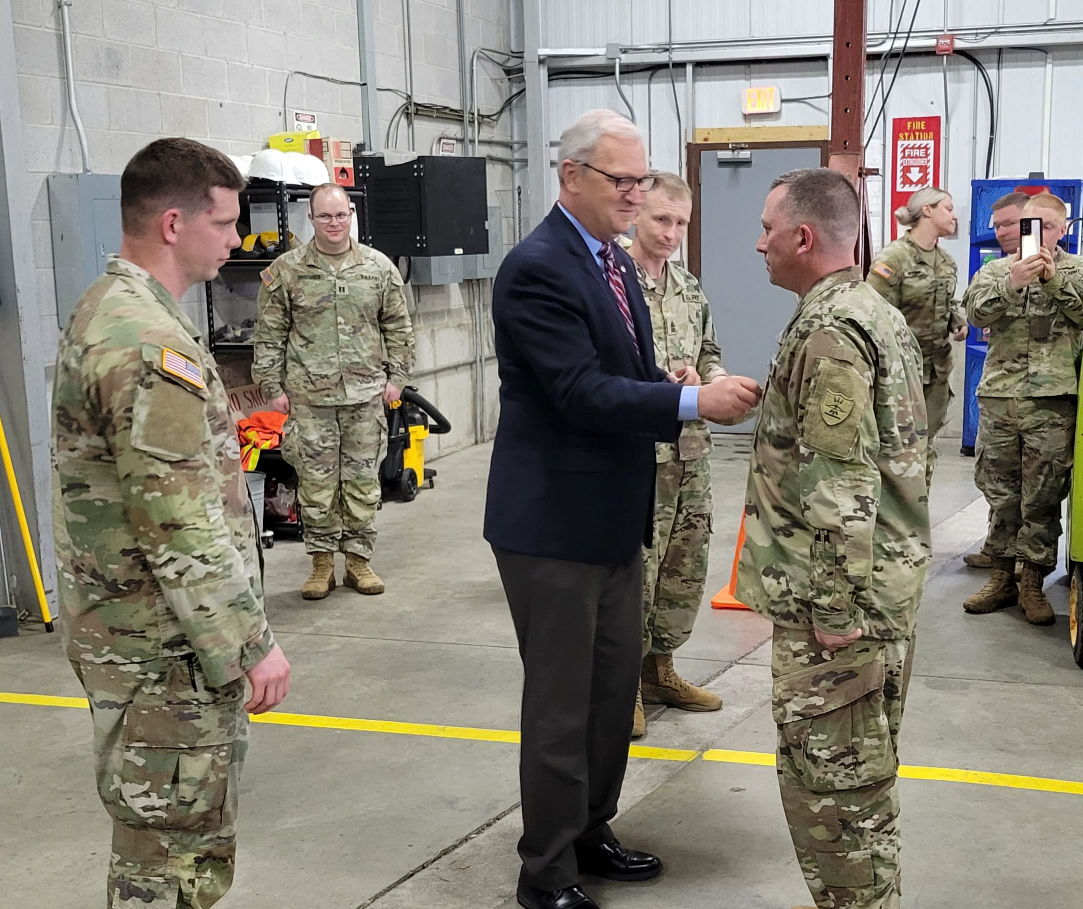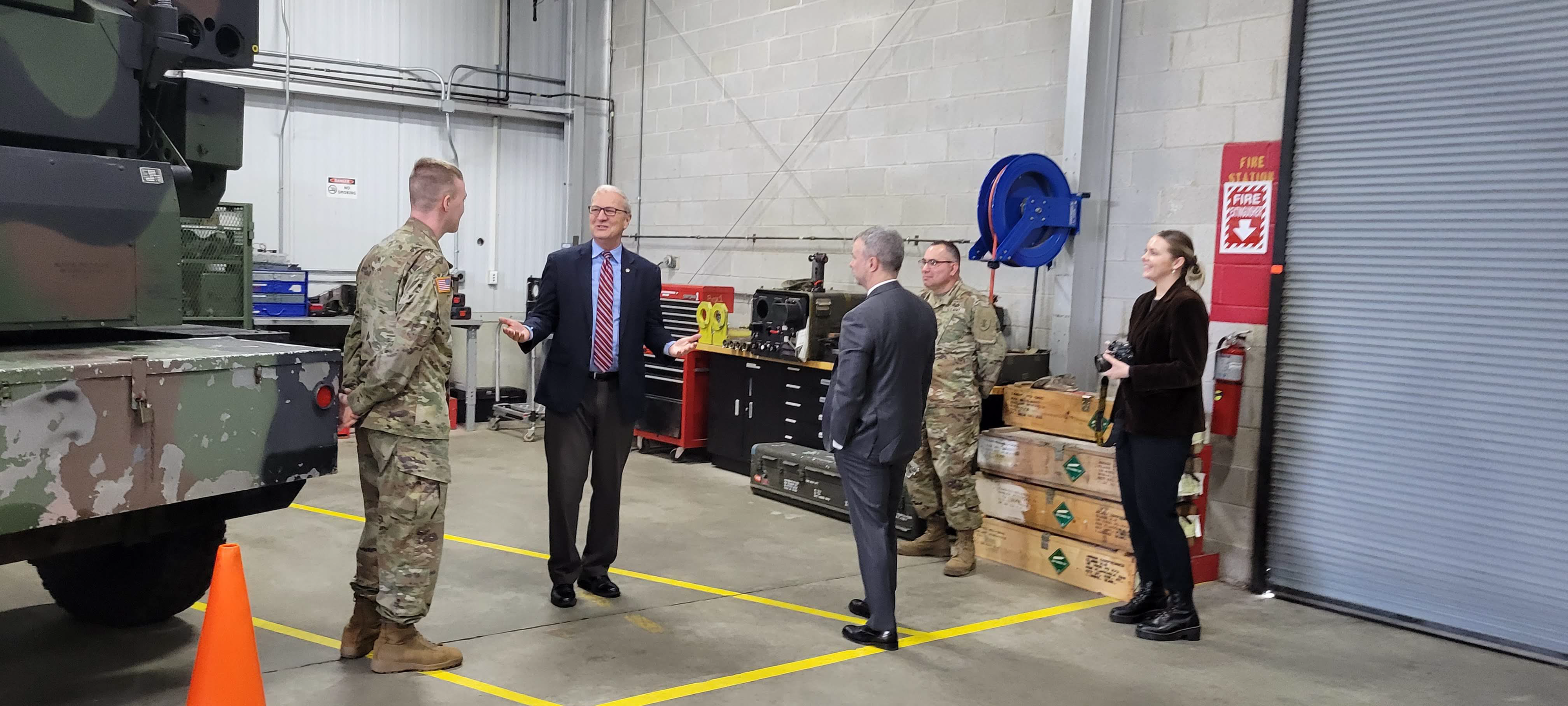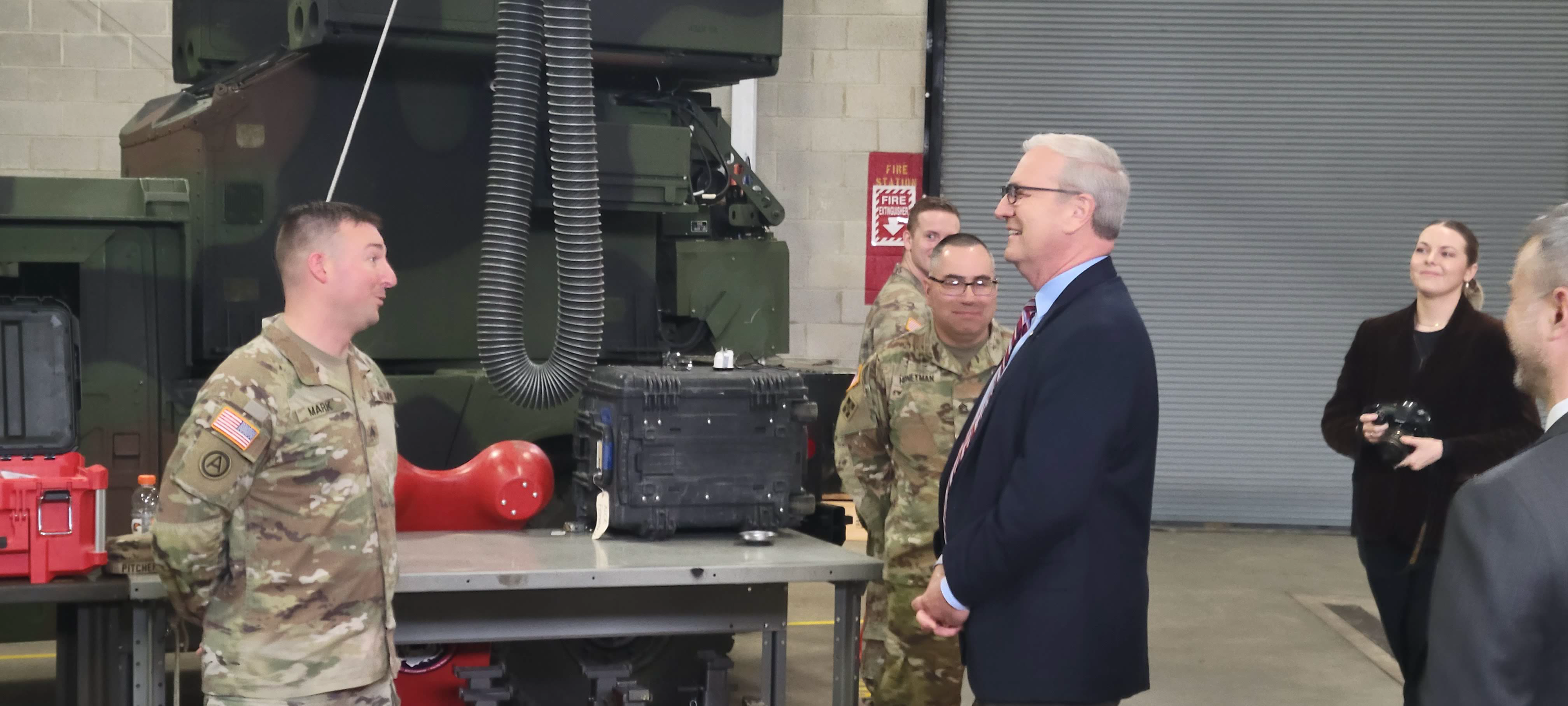 U.S. Sen. Kevin Cramer visited the Soldiers of the 1st Battalion 188th Air Defense Artillery Regiment (1-188th ADA) on mission in the National Capital Region at their training area and motor pool on Fort Belvoir, Virginia, April 7, 2022. (National Guard story by 1st Lt. Jacob Kipp 1st Battalion, 188th Air Defense Artillery Regiment)