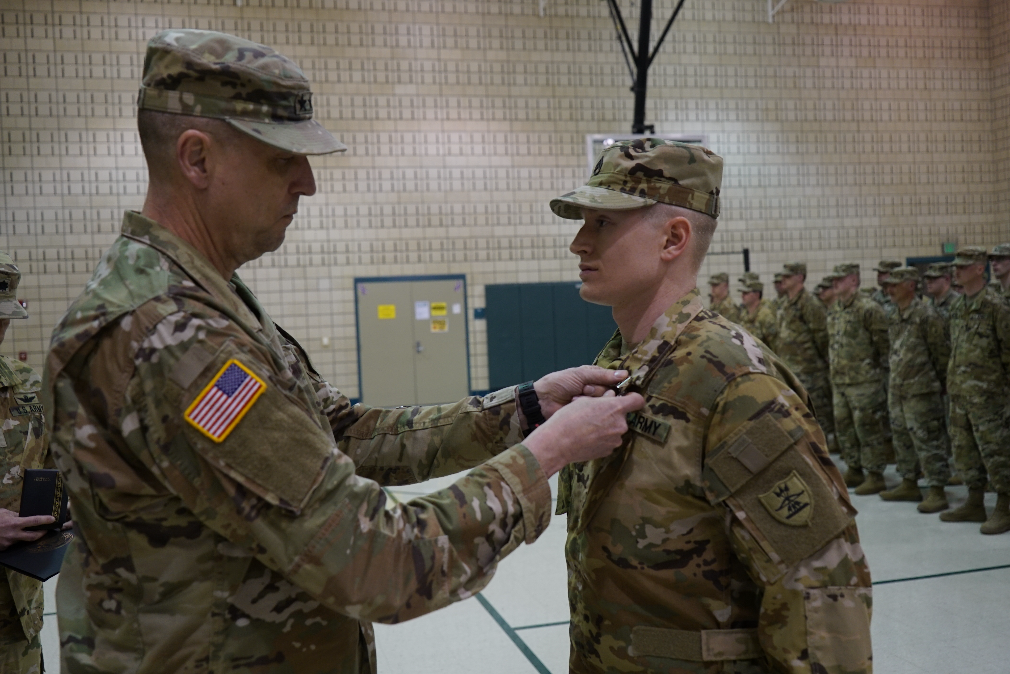 Sen. Kevin Cramer promotes Micheal Iverson, 1st Battalion 188th Air Defense Artillery Regiment, to the rank of staff sergeant at Fort Belvoir, Virginia, April 7, 2022. (National Guard photos by Spc. Josh Legg, 1st Battalion, 188th Air Defense Artillery Regiment)