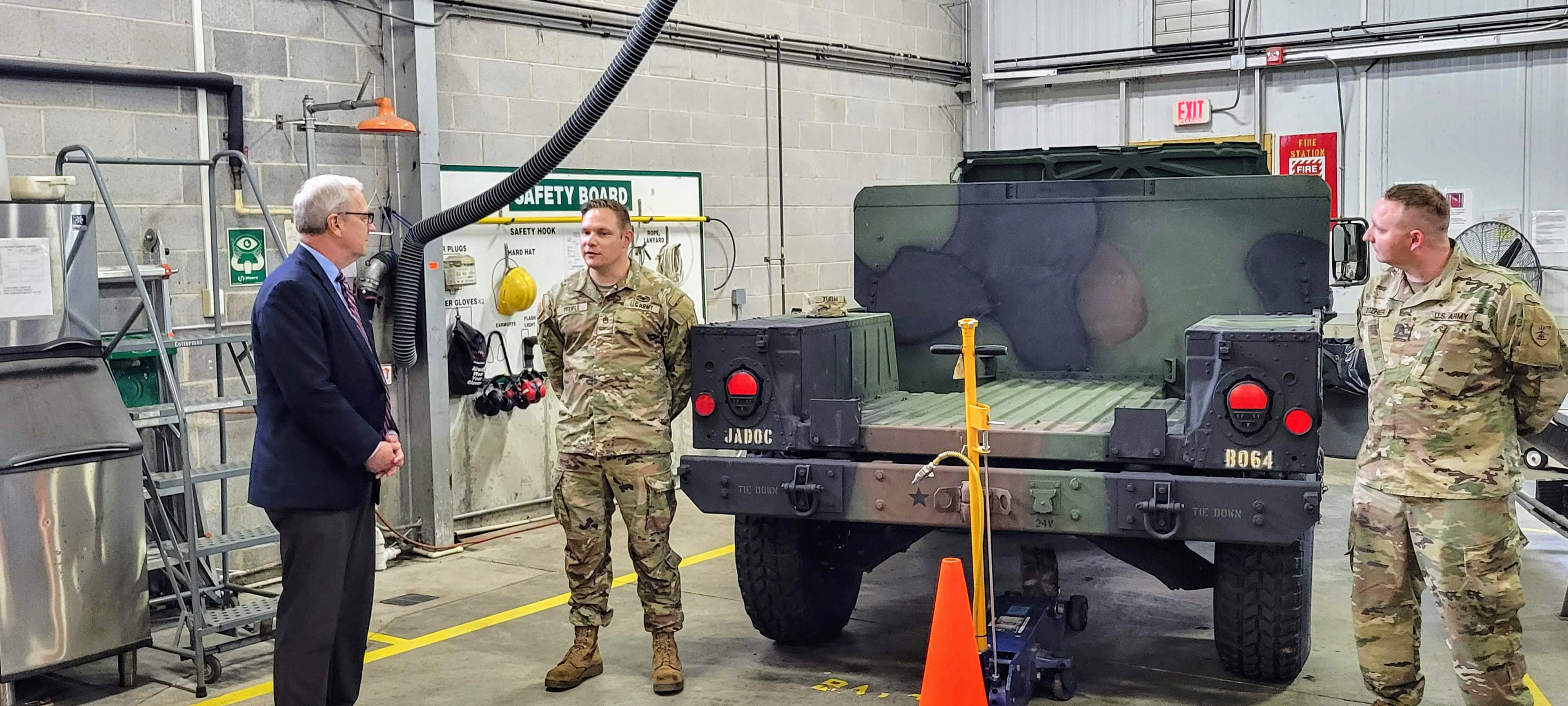 Sgt. Andrew Mark, 1st Battalion 188th Air Defense Artillery Regiment, briefs Sen. Kevin Cramer on maintenance operations at Fort Belvoir, Virginia, April 7.