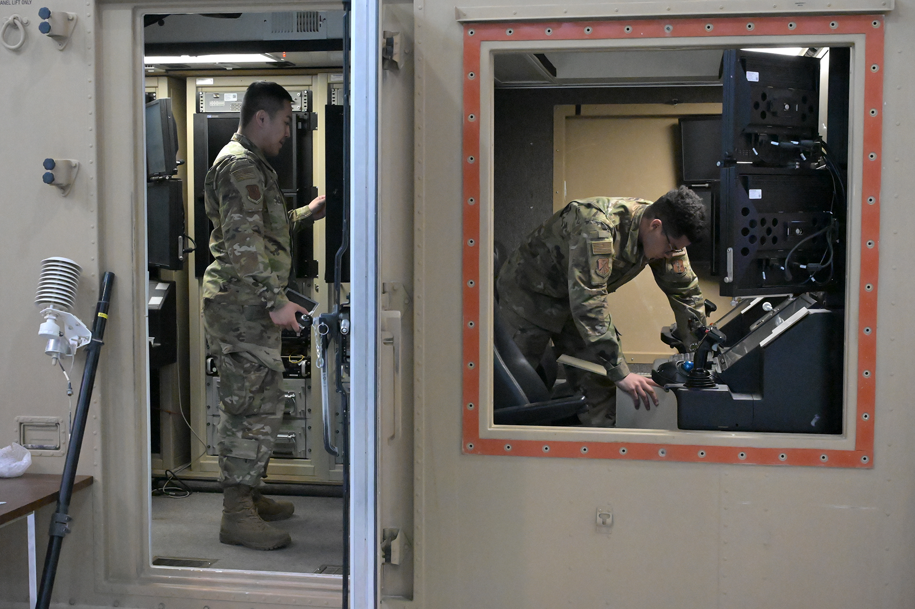 119th Aircraft Maintenance Squadron ground control station (GCS) maintainers inspect the mobile dual cockpit, Block 30 GCS as it arrives at the N.D. Air National Guard Base, April 12, 2022.