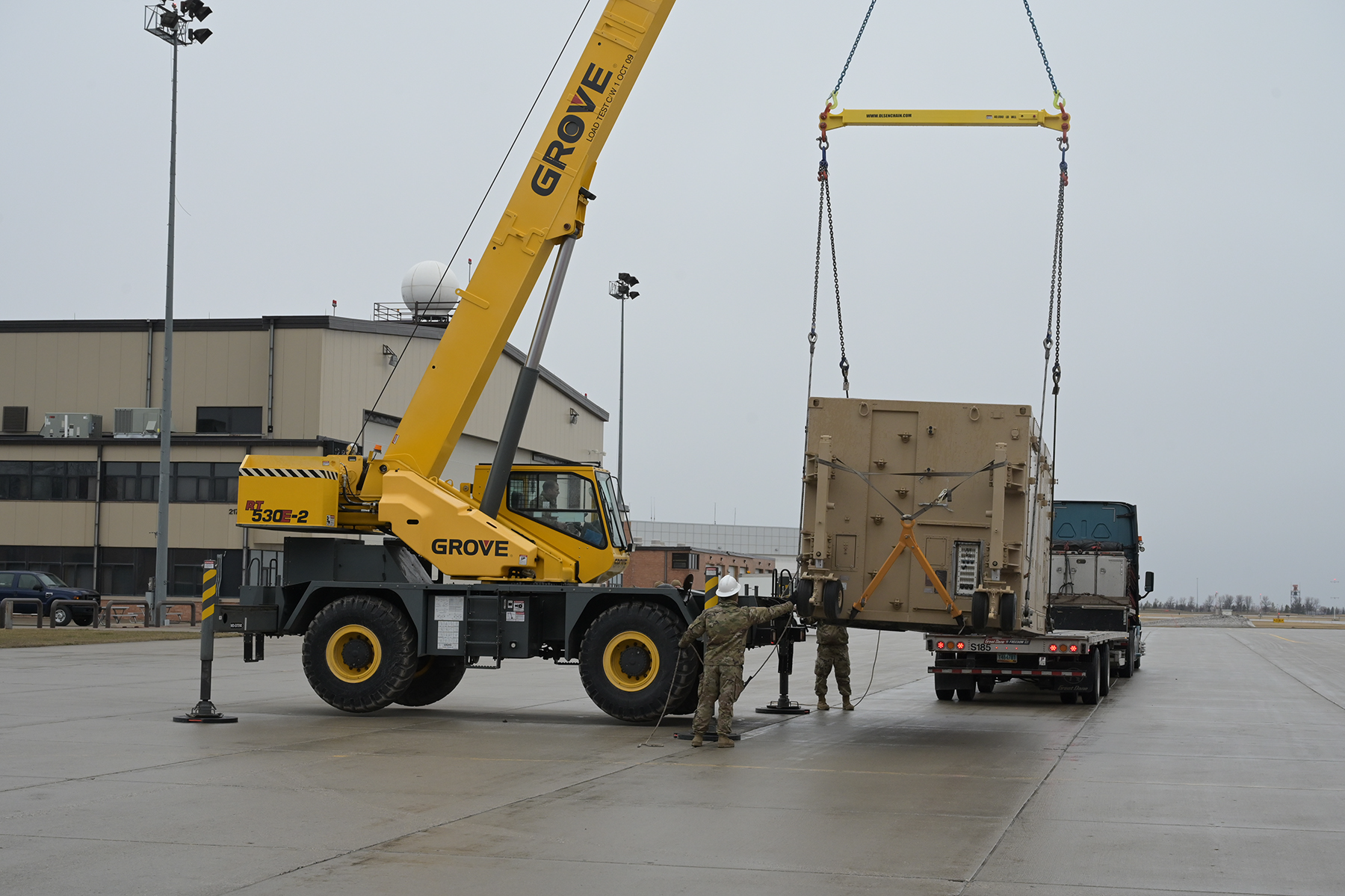 119th Aircraft Maintenance Squadron members use a crane to unload a mobile dual cockpit, block 30 ground control station (GCS) as it arrives at the N.D. Air National Guard Base, Fargo, April 12, 2022.