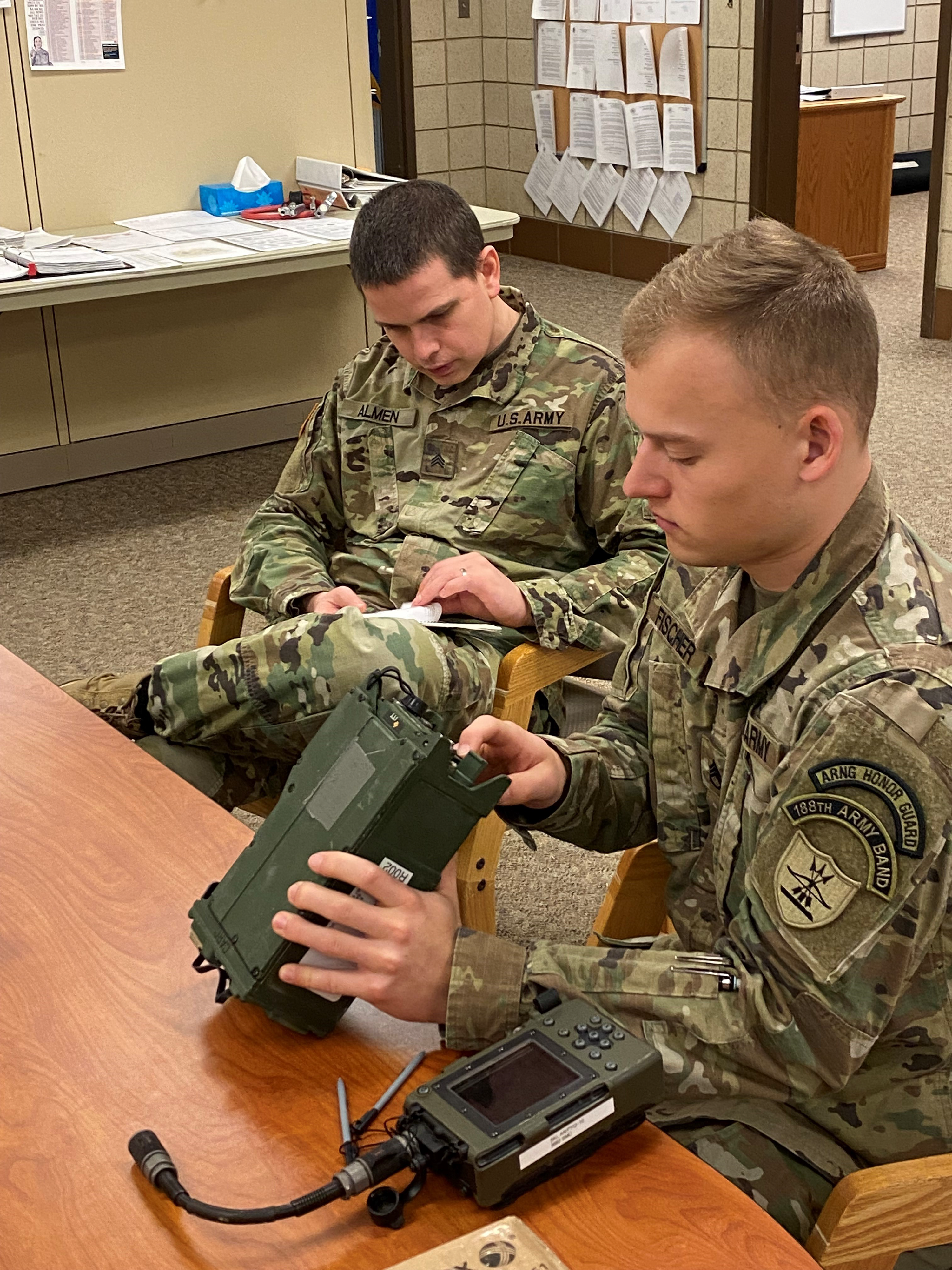 Sgt. Mitchell Almen, 164th Regional Training Institute, left, trains Staff Sgt. Zachary Fischer, 188th Army Band, on the basics of radio operations at Camp Grafton Training Center, April 9, 2022.