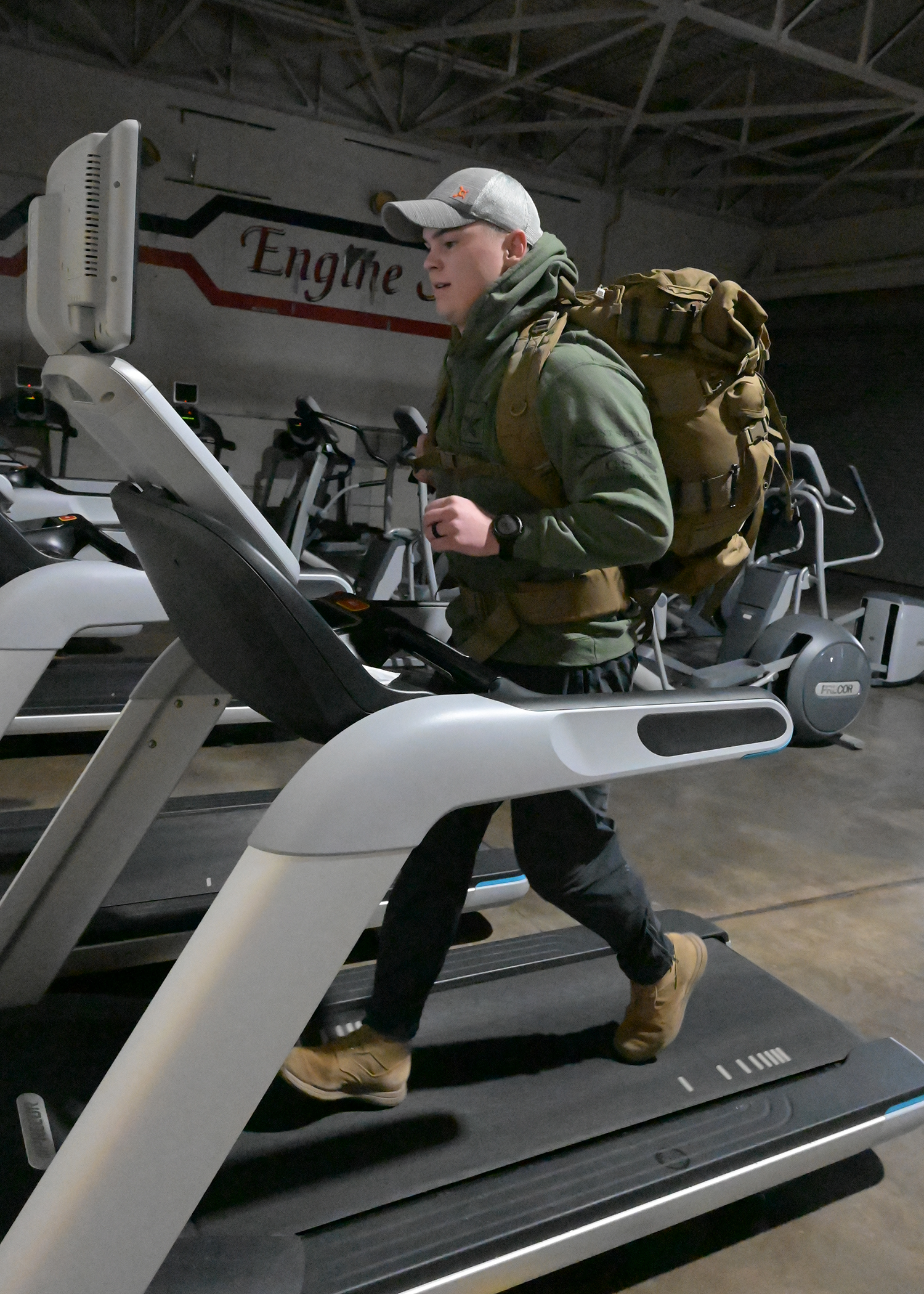 Staff Sgt. Austin Bonn, 119th Security Forces Squadron, trains on a treadmill at the N.D. Air National Guard Base, Fargo, April 14, 2022.