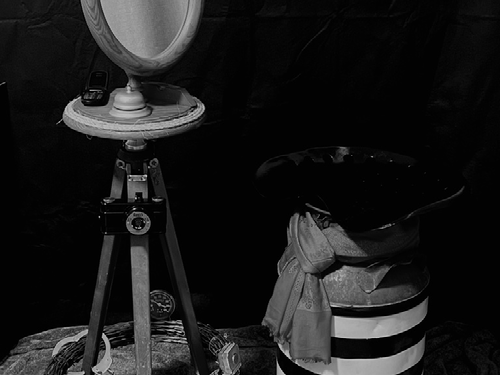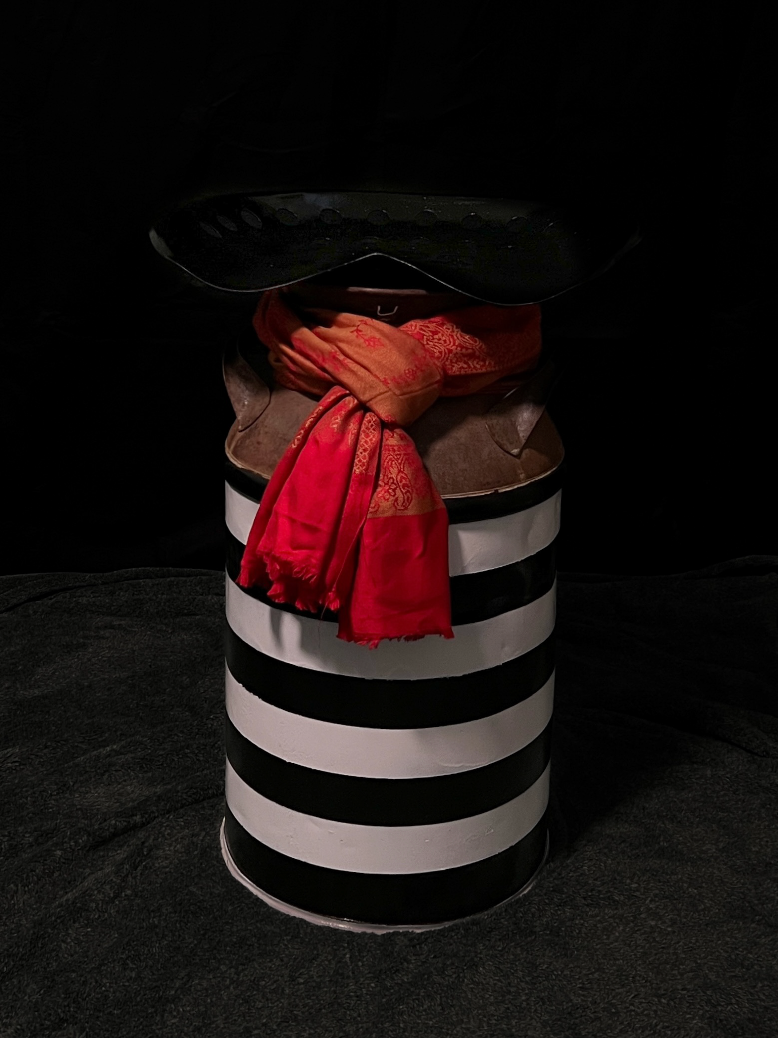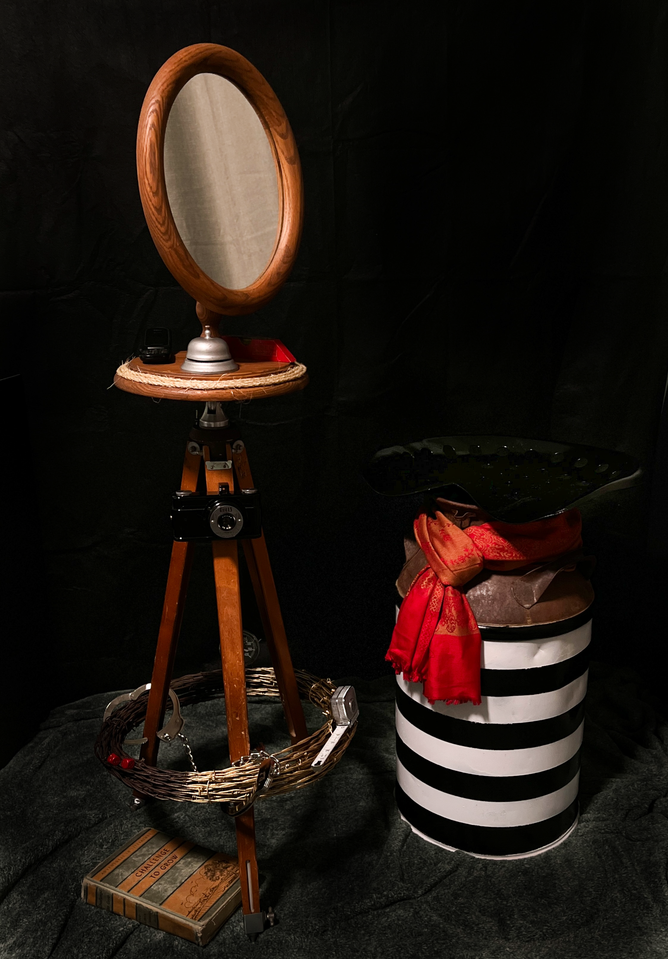 Curated elements: book • welded tractor seat • 10-gallon container • black & white paint • red shawl • wood and aluminum tripod • 18-inch diameter barb wire • gold spray finish • leg shackles • dice • tape measure • pressure gauge • jute rope • oak vanity mirror • film camera • flip phone • call-out hotel bell • wooden level