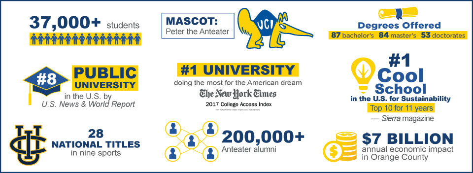Founded in 1965, UCI is the youngest member of the prestigious Association of American Universities. The campus has produced three Nobel laureates and is known for its academic achievement, premier research, innovation and anteater mascot. Led by Chancellor Howard Gillman, UCI has more than 30,000 students and offers 192 degree programs. It’s located in one of the world’s safest and most economically vibrant communities and is Orange County’s second-largest employer, contributing $5 billion annually to the local economy.