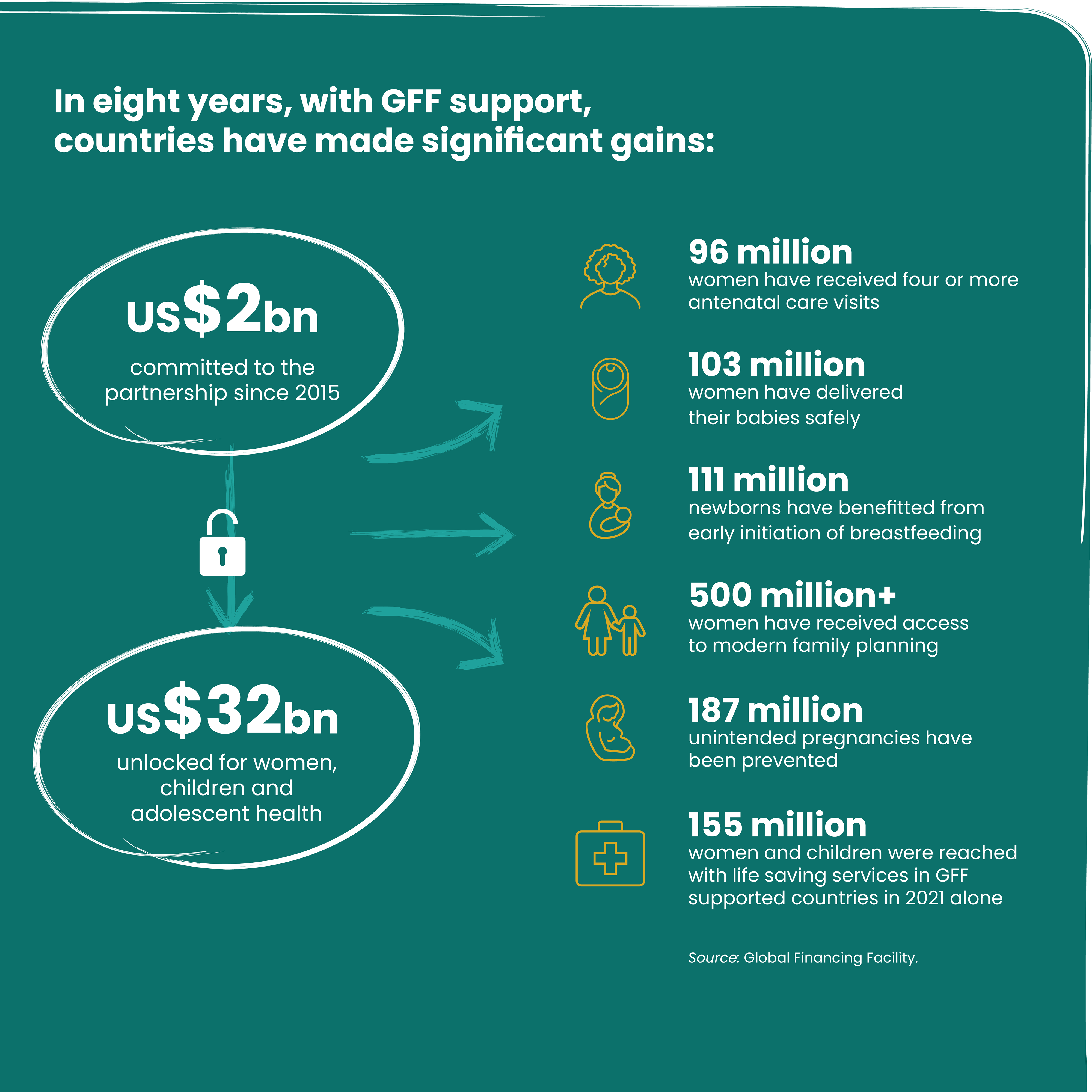 With the US$2 billion donors have committed to date, the GFF has unlocked US$32 billion for women, children, and adolescent health in partner countries. This support, over the past eight years, has helped countries to make significant gains: