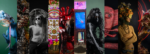 The plant series begins with photographed sculptures of branches and roots from mangroves, adorned with vegetables, fruits, dried chillis, ginger roots, dried flowers, coconuts, and other elements, some already decomposing, that the artist found suitable to her idea.