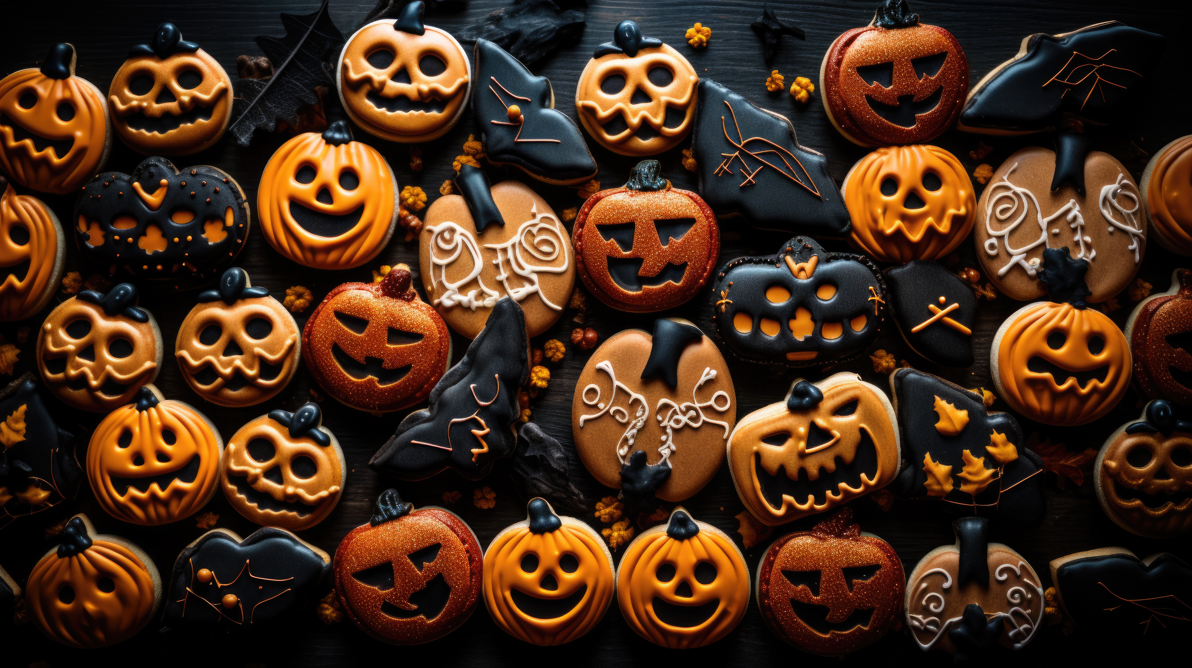 Created with images by Bits and Splits - "Rustic top view flat lay autumn arrangement decoration" • ISVO - "Pattern of decorated cookies in the shape of scary orange sugar pumpkins and chocolate bats on a dark scary background top view Halloween and Thanksgiving autumn cozy atmosphere holiday food concept" • Nastya - "Halloween craft for kids. Materials for creativity of orange, and black colors. Children's master class" • lordn - "Jack o Lantern - autumn Halloween holiday concept background" • shephotos - "Warm autumn season minimal background with realistic leaves on orange and yellow colors blurred background. Copy space. Space for text. Banner or header. Natural fall background or sale banner concept" • Ivan Kmit - "candles"