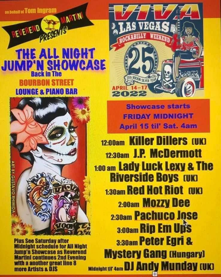Mozzy Dee has performed at Viva Las Vegas Rockabilly Weekend 21,22, 25, 26, & 27 including the Dave & Deke Hillbilly Fest & All Night Jumpin' Showcase, Walldorf Rock N Roll Weekender in Germany, Dapper Day, Goofin' Records 40th Anniversary Party in Finland, The 2023 Ameripolitan Awards, Red Hot & Blue Rockabilly Weekend in Canada, Western Swingout, Hot Rod Rock & Rumble, Mississippi Mayhem, Rockin' Route 66, Stellar Shows & Deke Dickerson's Barn Dance Boogie and more!