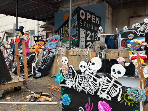At Saturday’s parade, a skeleton — crowned with red and yellow flowers and cocooned in a homemade corn husk — towered over attendees, propelled forward by a bicycle. Other marionettes perched on the sides of grocery carts as attendees with skeleton paint on their faces chatted and danced, waiting for the parade to begin.