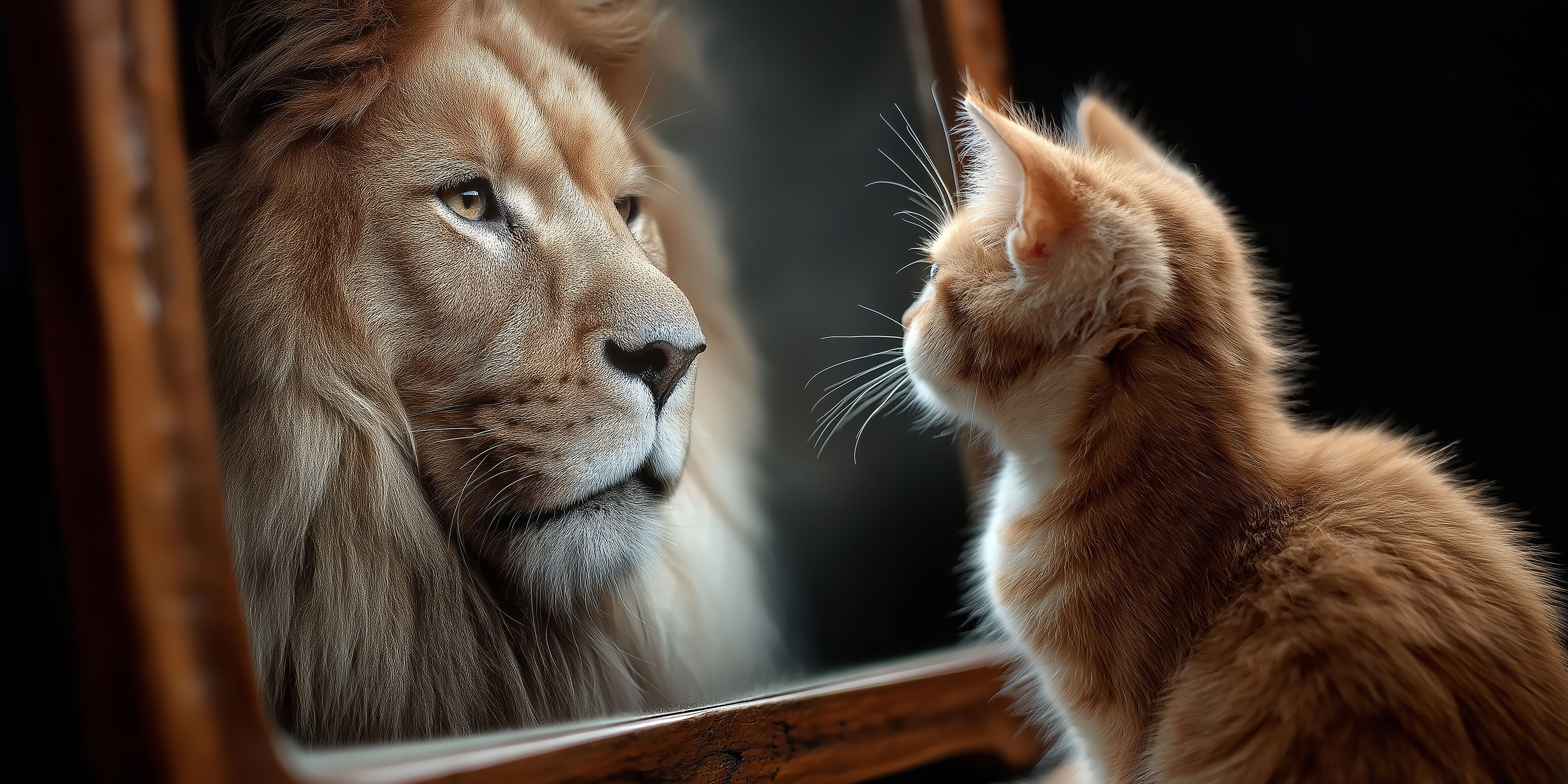 Created with images by gustavofrazao - "Wellness sign with a sunset background" • Uuganbayar - "Time to behavior change symbol. Wooden blocks with words 'behavior change'. Copy space. Business, psychology and behavior change concept." • Andres Mejia - "Kitten admiring lion reflection in mirror: overcoming fear and building confidence" • stockpics - "Change your thoughts and you´ll change your world! - Text on street"