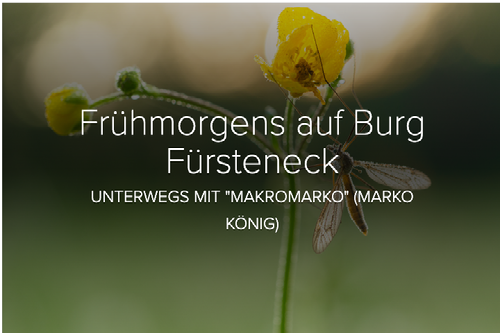 Dieses Jahr war endlich wieder einmal Marko König (Beiname Makromarko) als Dozent bei den Fürstenecker Fototagen. Leider kann ich als Dozent keinen Kurs bei ihm belegen. Daher hatte ich mir sehr gefreut, als ich hörte, dass er eine frühmorgendliche Exkursion für alle Interessierten anbieten möchte. Als ambitionierter Makro-Rookie ist es für mich natürlich sehr interessant mit Marko unterwegs zu sein, der - wie immer wieder gehört - "jedes Insekt mit Vornamen kennt". Ich war also direkt der Erste, der sich in die Liste eingetragen hatte. Start war Samstag morgen - 5:30. Ein Termin, der sich als durchaus problematisch für mich herausstellte. Schließlich gab es in der Nacht vorher die Aurora Borealis von Burg Fürsteneck aus zu fotografieren, was mich reichlich spät ins Bett kommen ließ. Näheres ist hier nachzulesen.