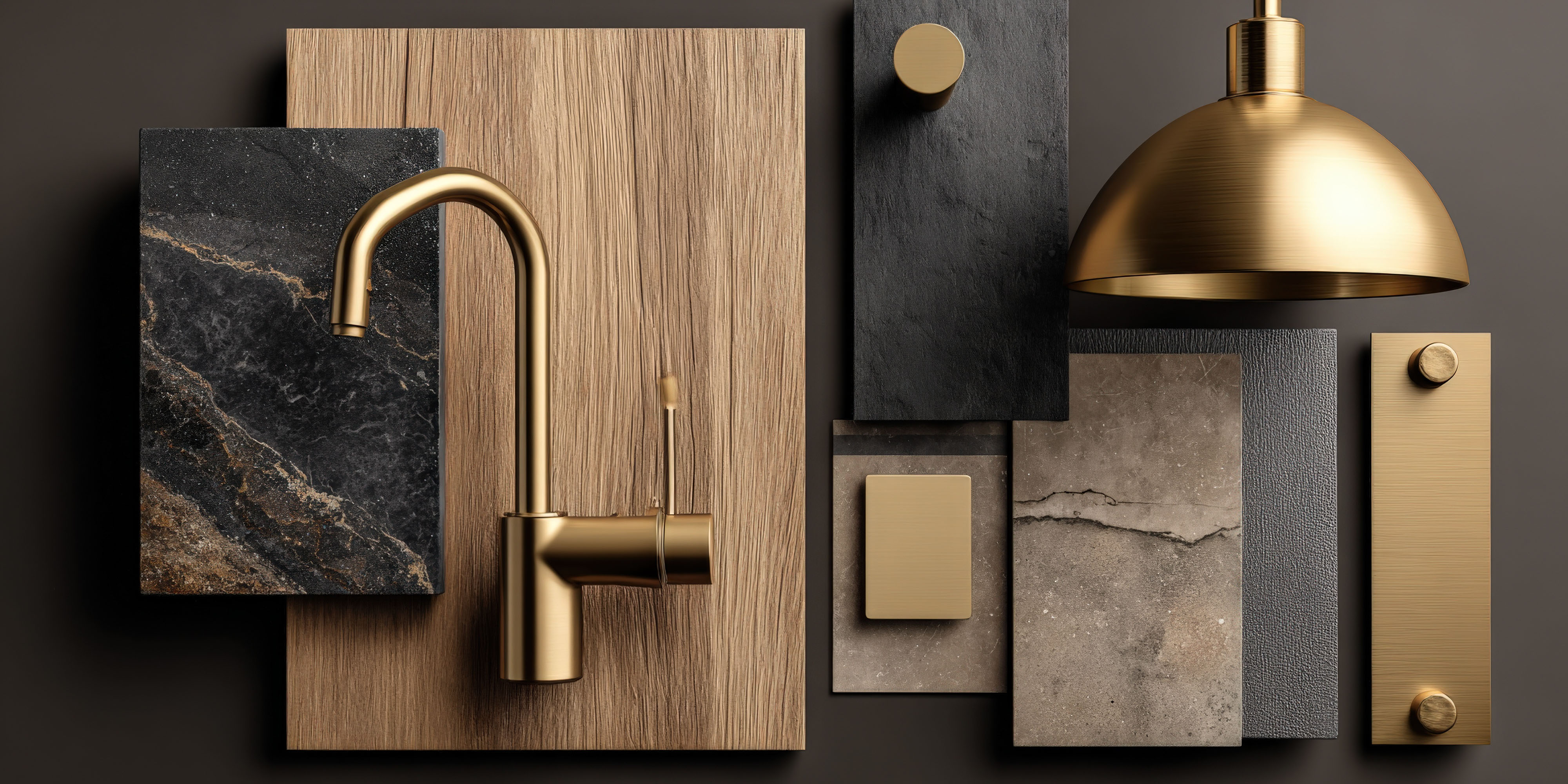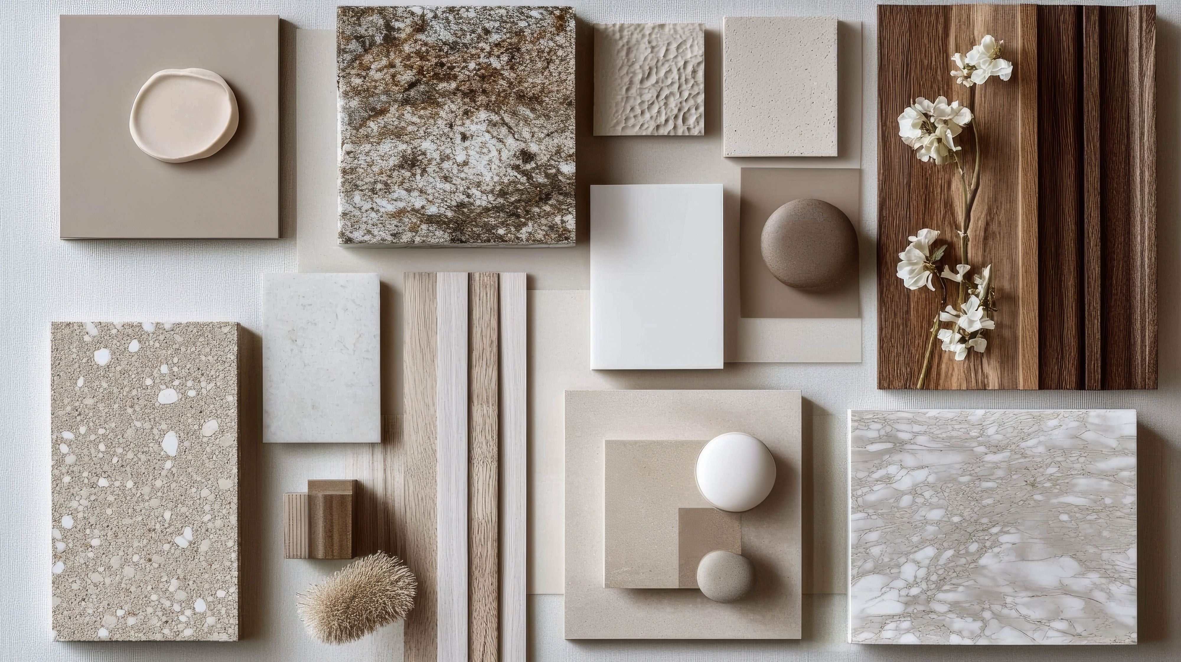Created with images by Khawla - "A flat lay of interior design material samples including marble, wood, and stone in neutral and earthy tones, minimalist photography, trending on Pinterest" • Working Moments - "Neutral Tones Material Mood Board Flatlay Composition of Beige, Brown and White Textures, Interior Design Concept Interior Design, Mood Board" • Vadim Andrushchenko - "Stylish elegant sofa in minimalist, scandinavian home interior design of modern living room with staircase." • Рудой Максим - "Modern kitchen interior with elegant stone island and ambient lighting" • The Little Hut - "Interior design mood board featuring gold faucet, natural wood, stone and metallic accents for luxurious renovation projects" • Rawpixel.com - "Massage room of wellness spa furniture chair interior design."