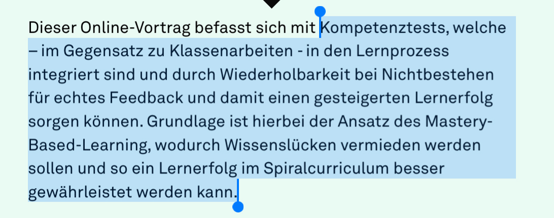 „Kompetenztests, welche – im Gegensatz zu Klassenarbeiten - in den Lernprozess integriert sind und durch Wiederholbarkeit bei Nichtbestehen für echtes Feedback und damit einen gesteigerten Lernerfolg sorgen können. Grundlage ist hierbei der Ansatz des Mastery-Based-Learning, wodurch Wissenslücken vermieden werden sollen und so ein Lernerfolg im Spiralcurriculum besser gewährleistet werden kann. Dieses Diagnoseinstrument ermöglicht der Lehrkraft fortan, Teams für Projektarbeiten gezielter nach individuellen Stärken zusammenzustellen und so Interdisziplinarität beim Lösen von Problemen zu fördern.