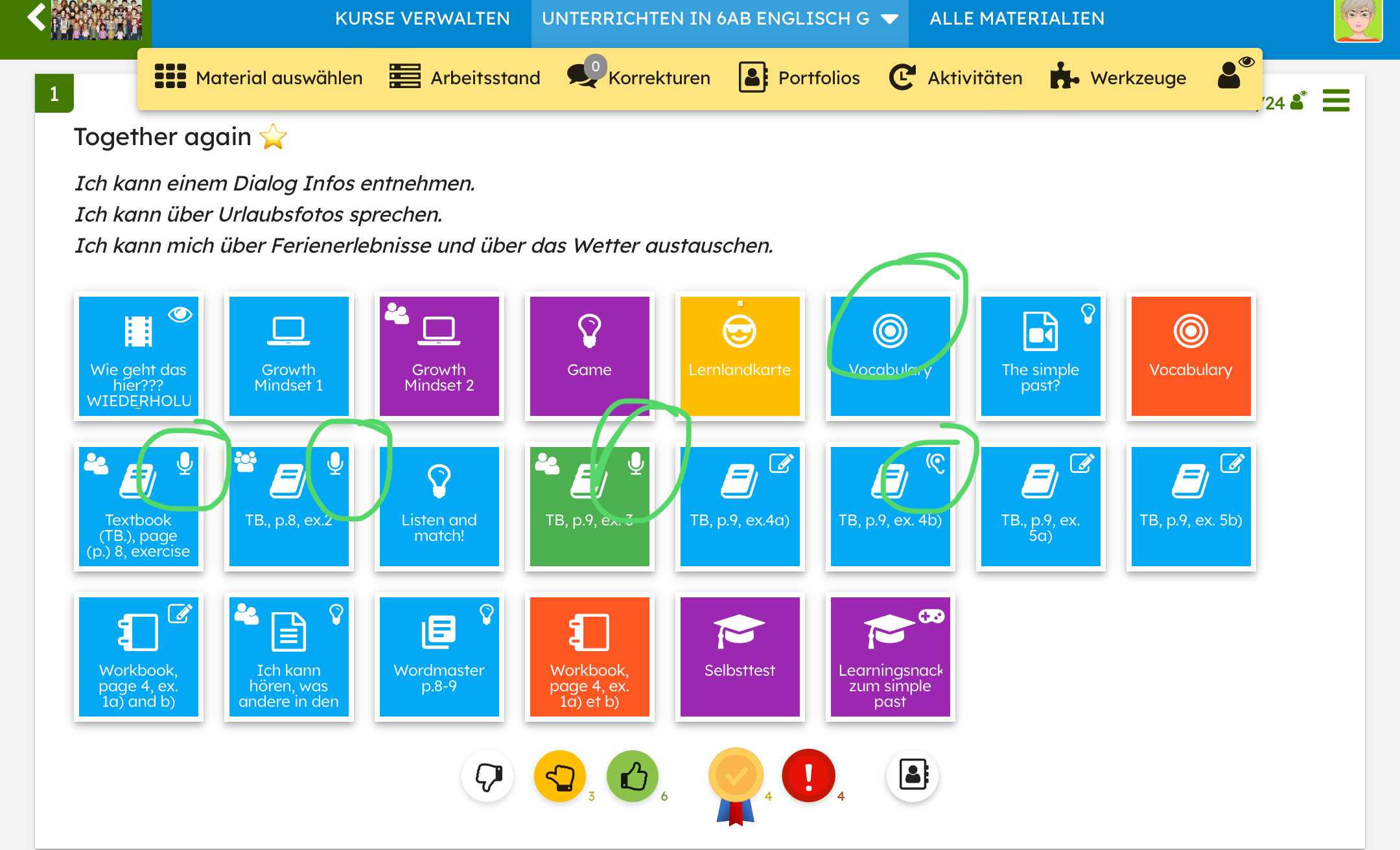 Sprechen wird hier in Einzel-, Partner- oder Gruppenarbeit als Audioaufnahme oder als Video innerhalb der jeweiligen Aufgabe (grün umkreist) abgegeben. Hier arbeiten alle Schülerinnen und Schüler parallel. D.h. kein Warten, bis man aufgerufen wird. Durch die Lehrkraft erfolgt anschließend das Audio- oder Video-Feedback. Sprachvorbild ist hier entweder die Lehrkraft in Erklärvideos oder das Audio des Lehrwerks.