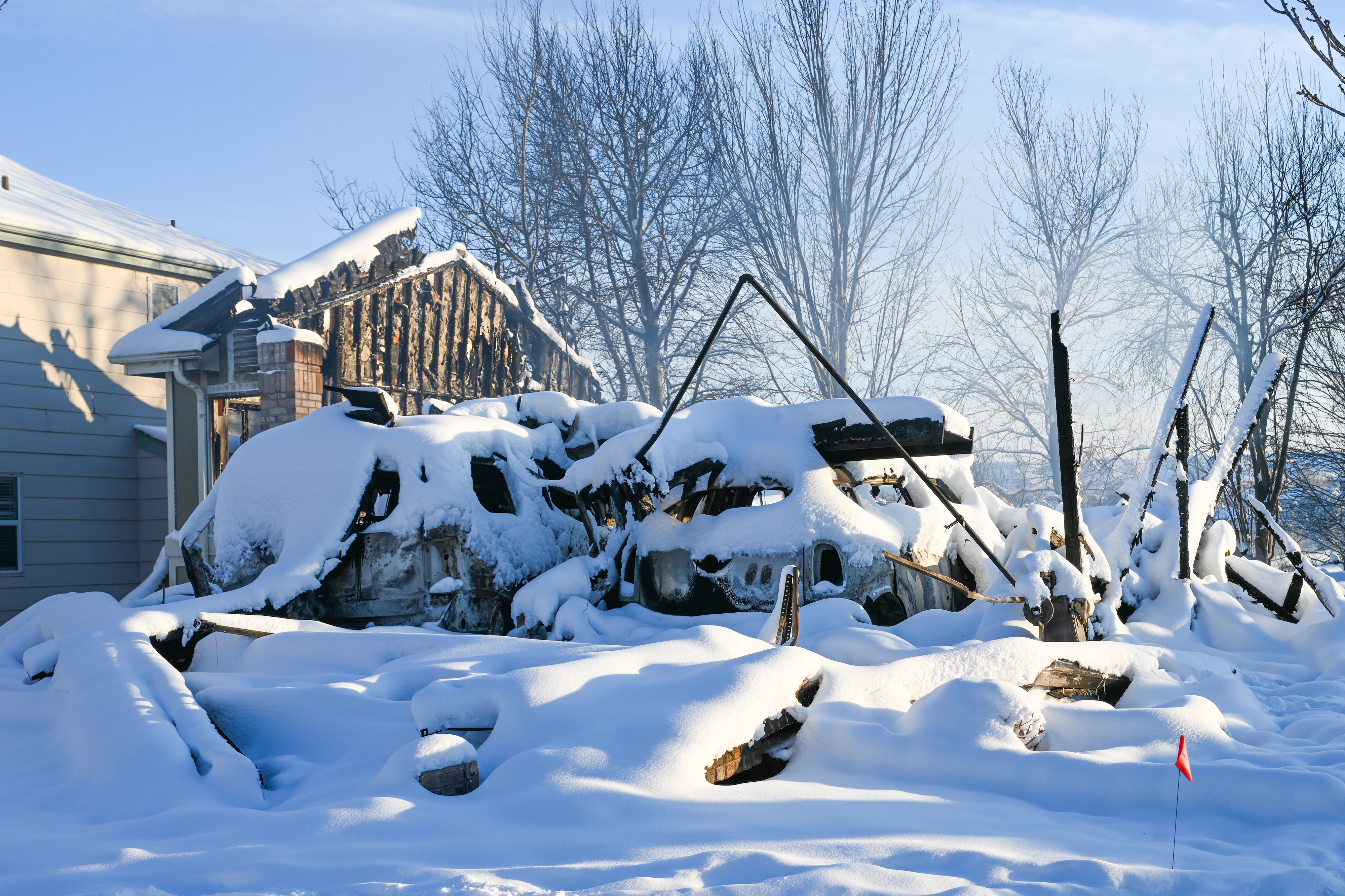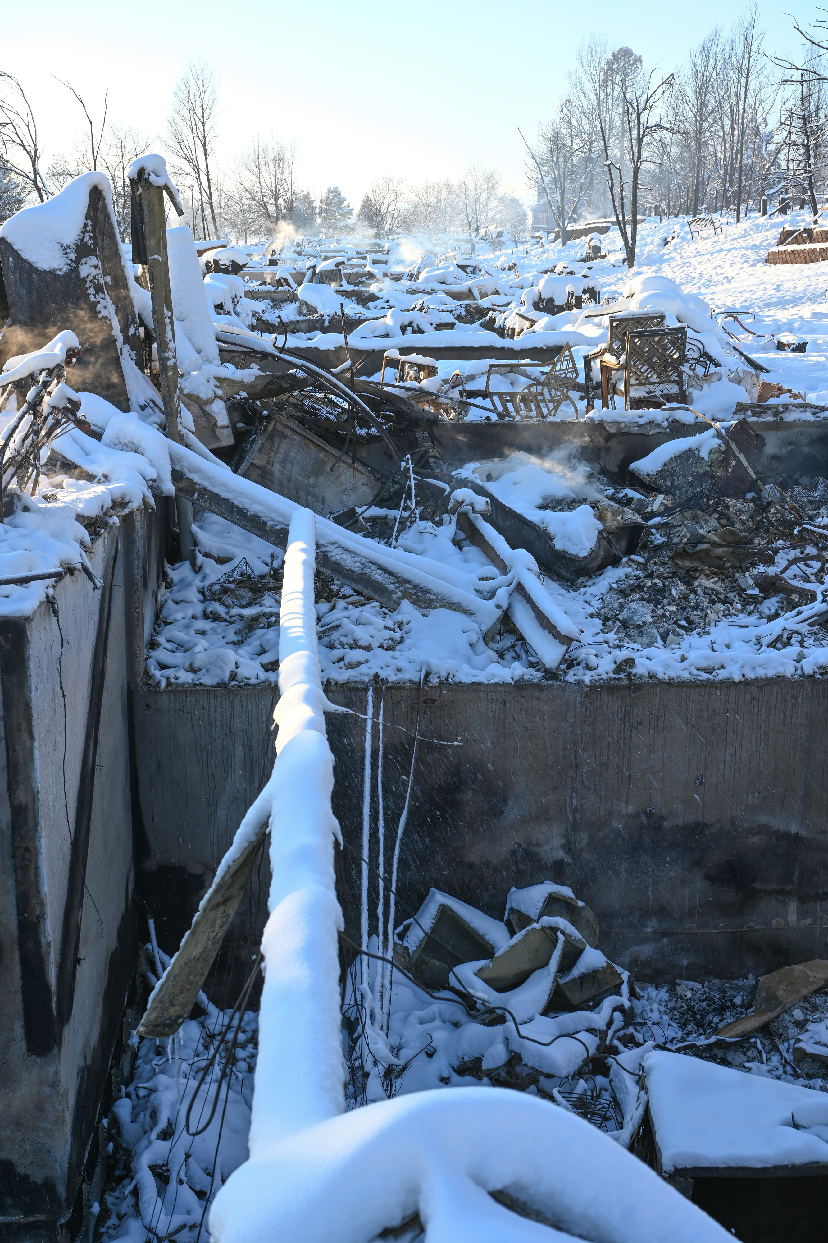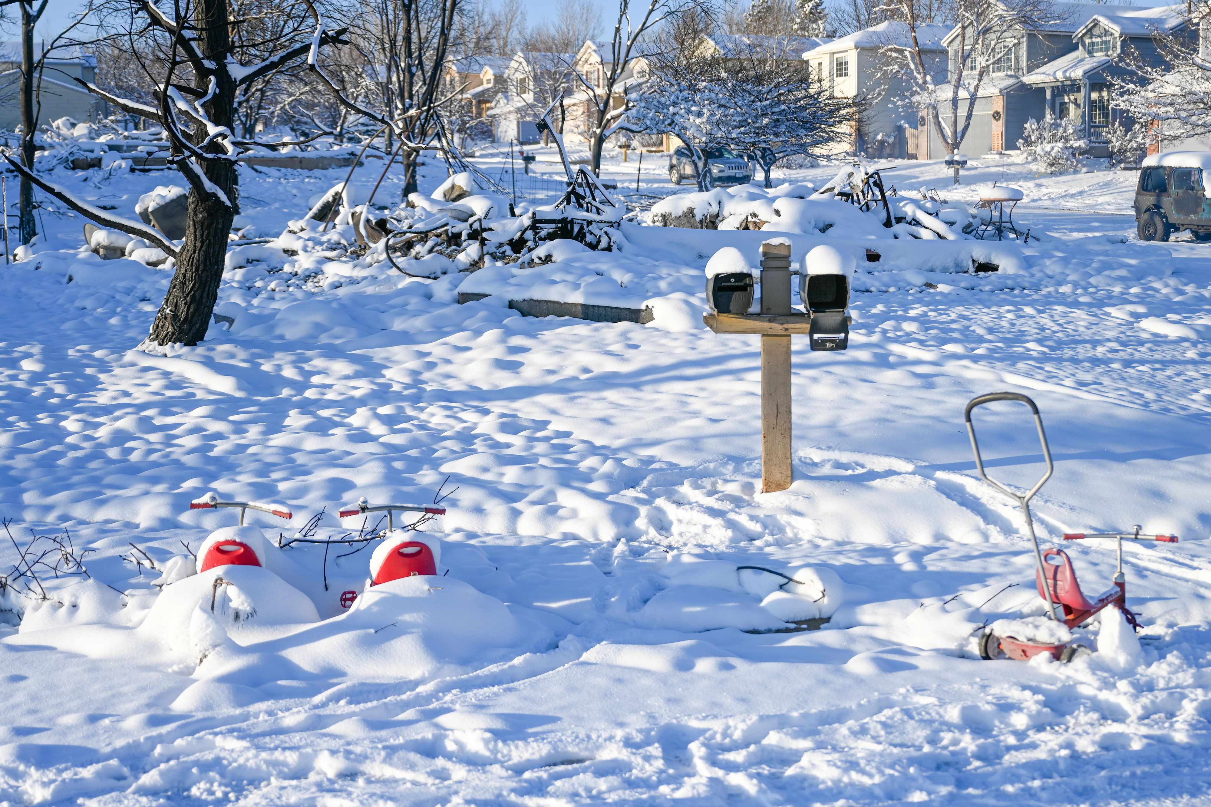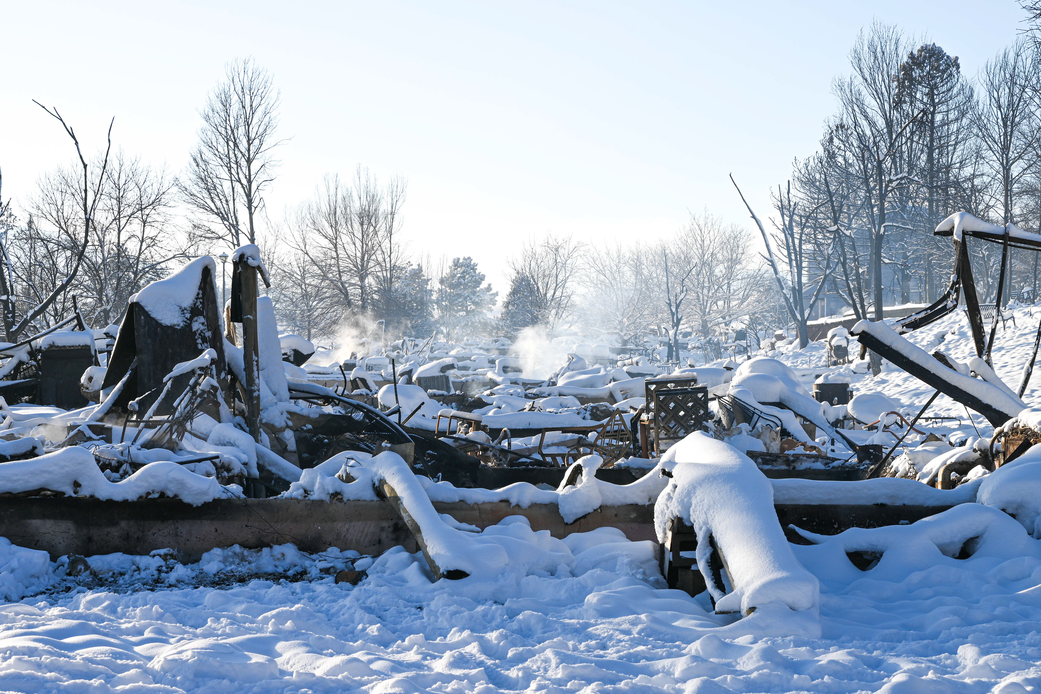Photos below are from the Creekside housing area in Superior, Colorado. According to authorities, three hundred thirty-two homes were destroyed by the fire in this housing area. The debris and remains of burned-to-the-ground structures are covered with up to eight inches of snow. Some structures are still smoldering.