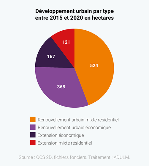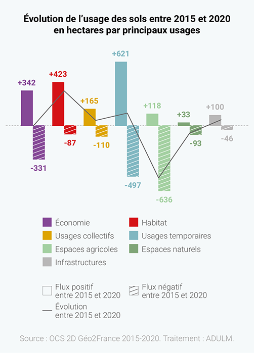 - des surfaces dédiées à l’économie globalement équivalentes : même si la production de foncier exclusivement à l’économie a été de 342 hectares, 331 hectares ont quant à eux trouvé un autre usage (chantier, habitat...) ;
