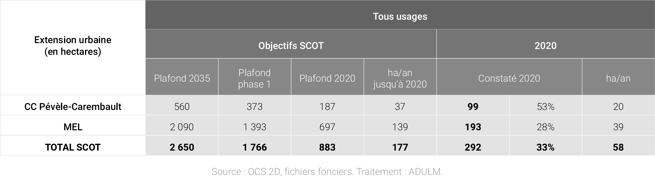 L’analyse du développement urbain sur cette première période d’application du SCOT est encourageante par rapport aux objectifs promus dans le document. En effet, les enveloppes d’extension urbaine au sens du SCOT (artificialisation en dehors de la tache urbaine de référence) définies dans sa phase 1 ont été largement respectées : moins de 60 hectares par an « consommés » pour près de 180 hectares par an mobilisables. Les plafonds en extension urbaine sont définis à hauteur de 883 hectares entre 2015 et 2020 dans le SCOT, soit 520 hectares pour l’usage résidentiel mixte et 363 hectares pour le développement économique. On constate qu’en 2020 : 121 hectares ont été consommés à des fins d’habitat, soit moins de ¼ de l’enveloppe définie pour le logement. 167 hectares ont été consommés à des fins économiques, soit moins de la moitié de l’enveloppe définie pour l’économie.