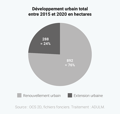 La production de locaux d’activités mobilise également très fortement le potentiel en renouvellement urbain avec 368 hectares, soit 70% des surfaces développées à des fins économiques qui se situent en renouvellement urbain.