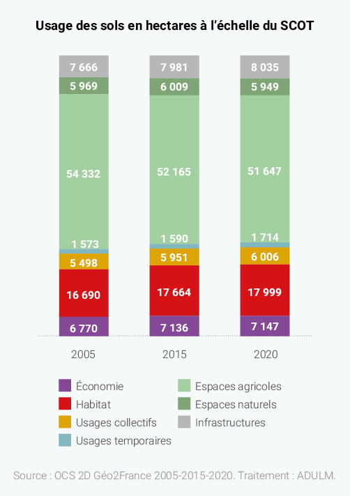 À dominante agricole à hauteur de 60%, le territoire du SCOT de Lille Métropole compte 40% de surfaces artificialisées, dont 18% sont consacrées à des usages d’habitat contre 7% pour l’économie et 8% aux infrastructures. Comme prescrit dans le SCOT, dans cette première période de 2015 à 2020, l’extension urbaine connaît une forte diminution avec moins de 60 hectares «consommés» par an, pour une enveloppe autorisée de près de 180 hectares par an.