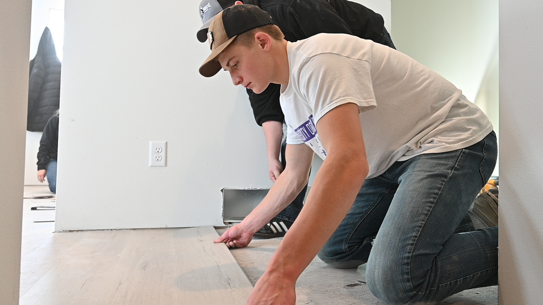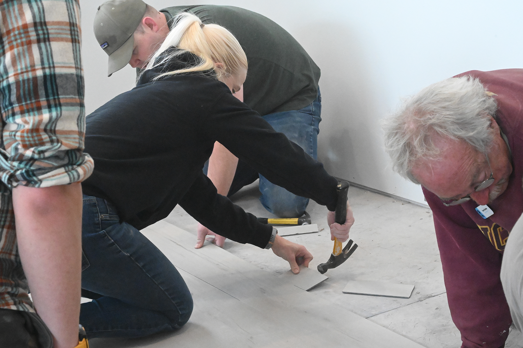 Senior Master Sgt. Danelle Card, 119th Operations Group, foreground, helps install flooring as a volunteer for the Lake Agassiz Habitat for Humanity build on November 14, 2022.