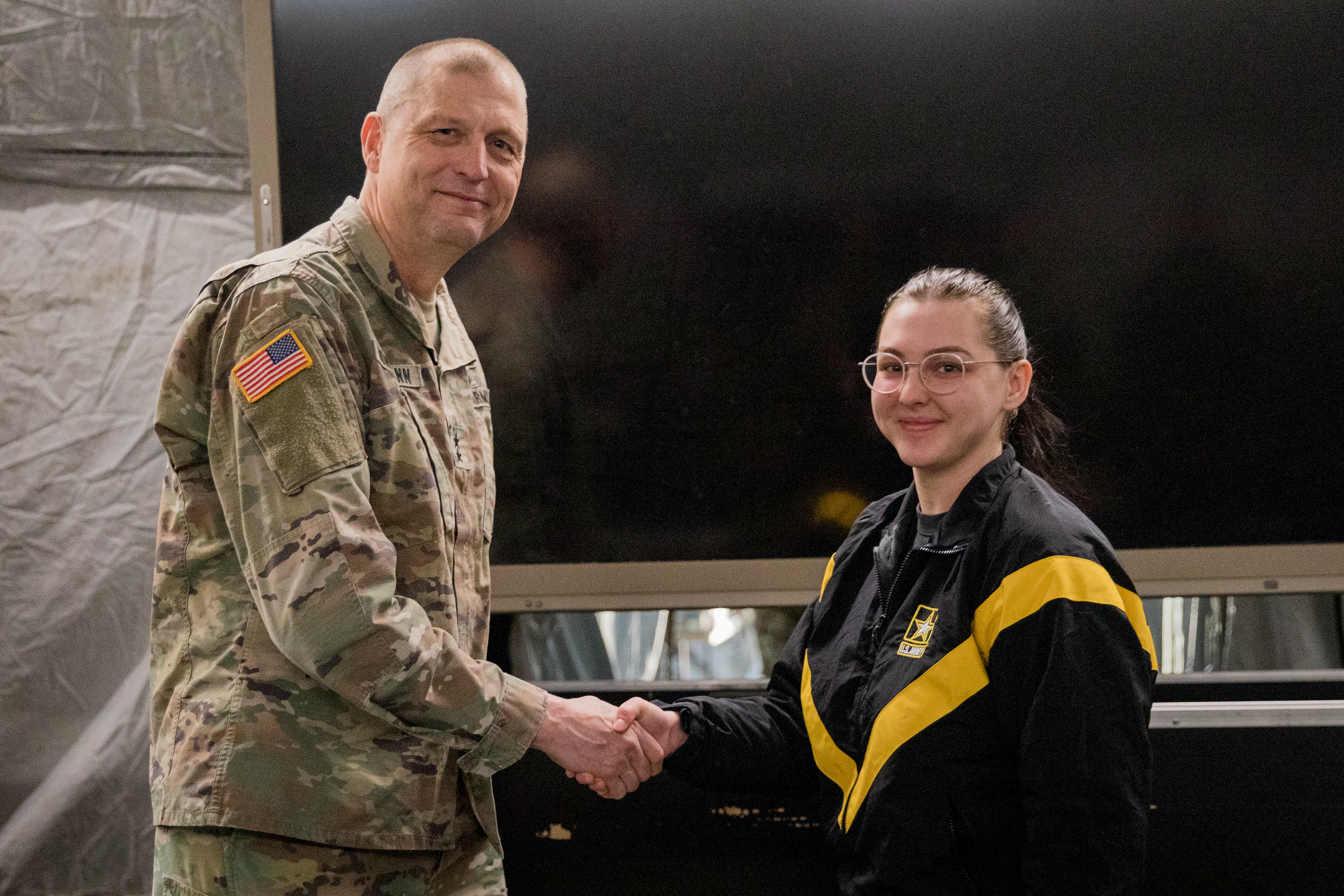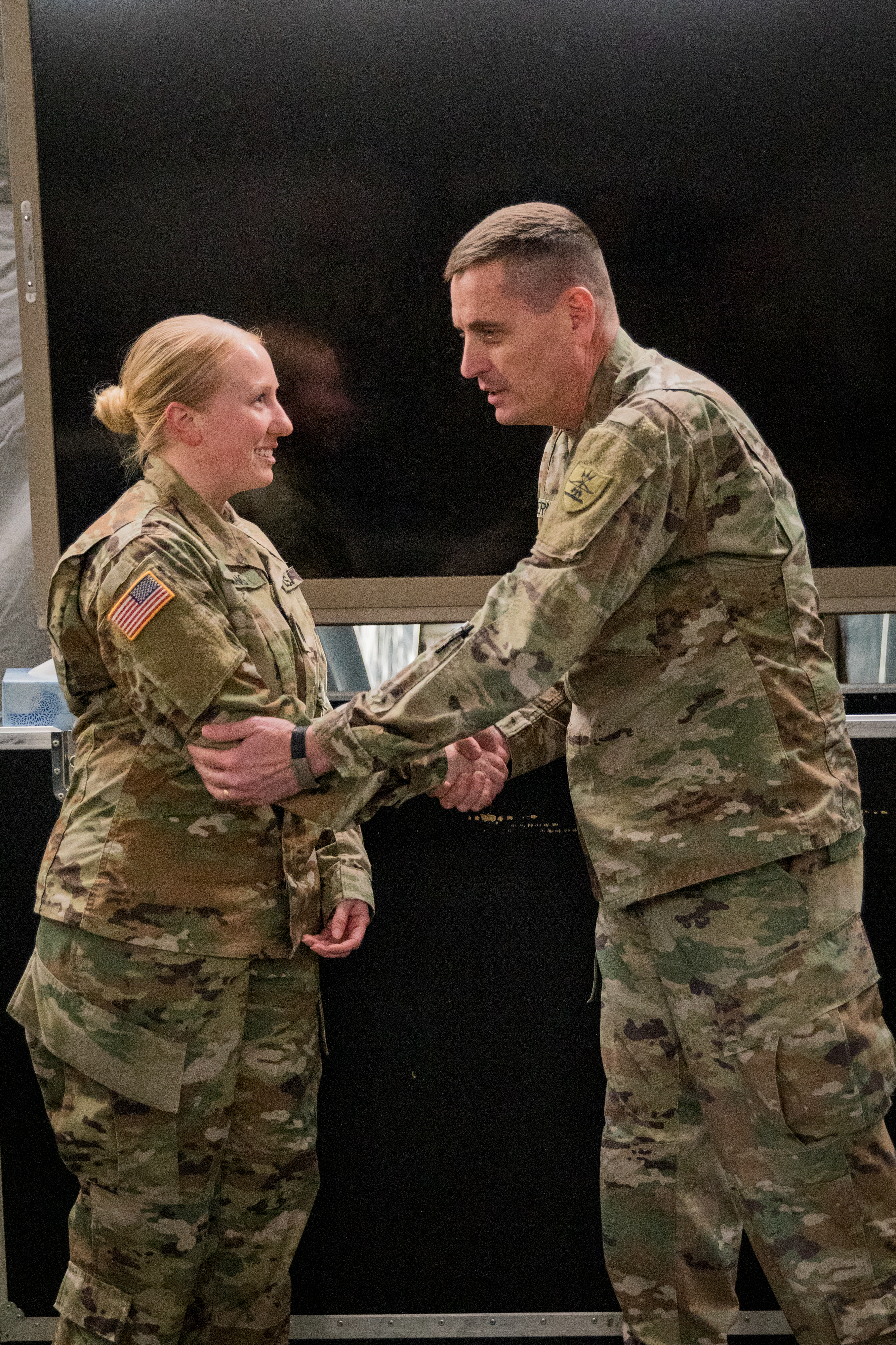 Maj. Gen. Al Dohrmann, left, N.D. adjutant general presents a recognition coin to Spc. William Eberle, 141st Maneuver Enhancement Brigade, during his unit's Warfighter exercise, Camp Atterbury, Indiana, Nov. 2, 2022.