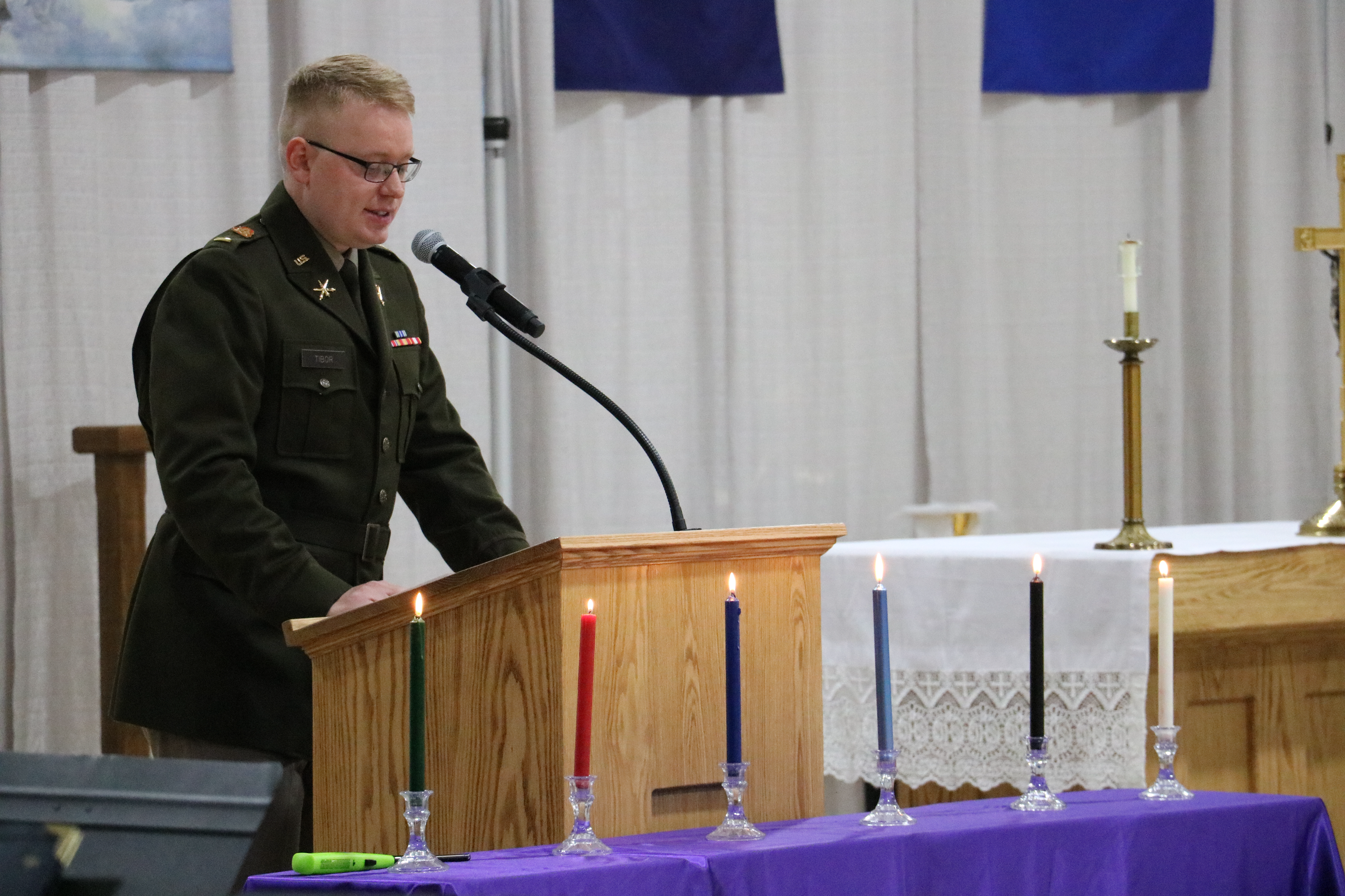2nd Lt. Kellen Tibor, 1st Battalion, 188th Air Defense Artillery Regiment, an 8th grade social studies teacher at Light of Christ Catholic Schools, was the featured speaker.