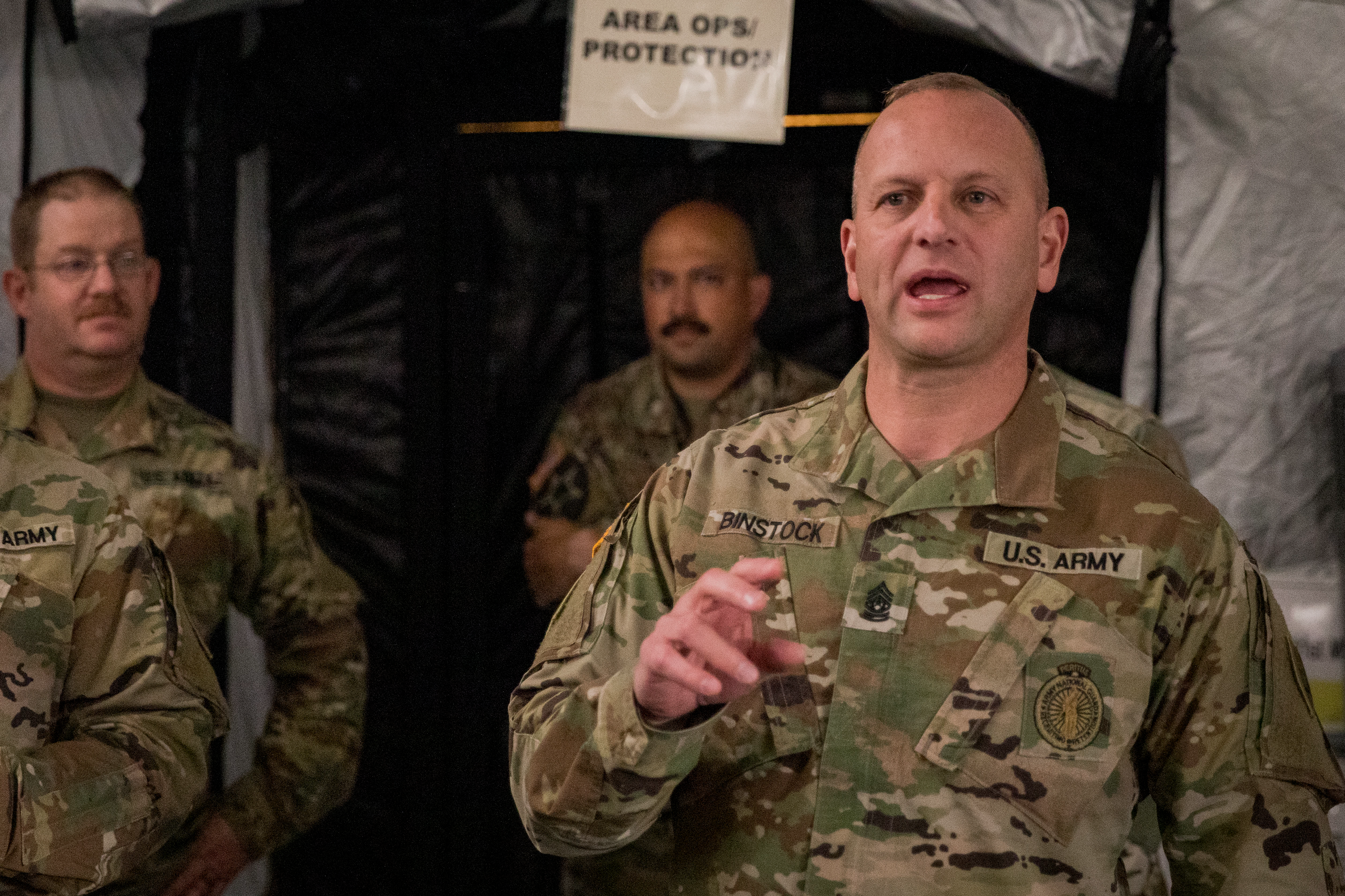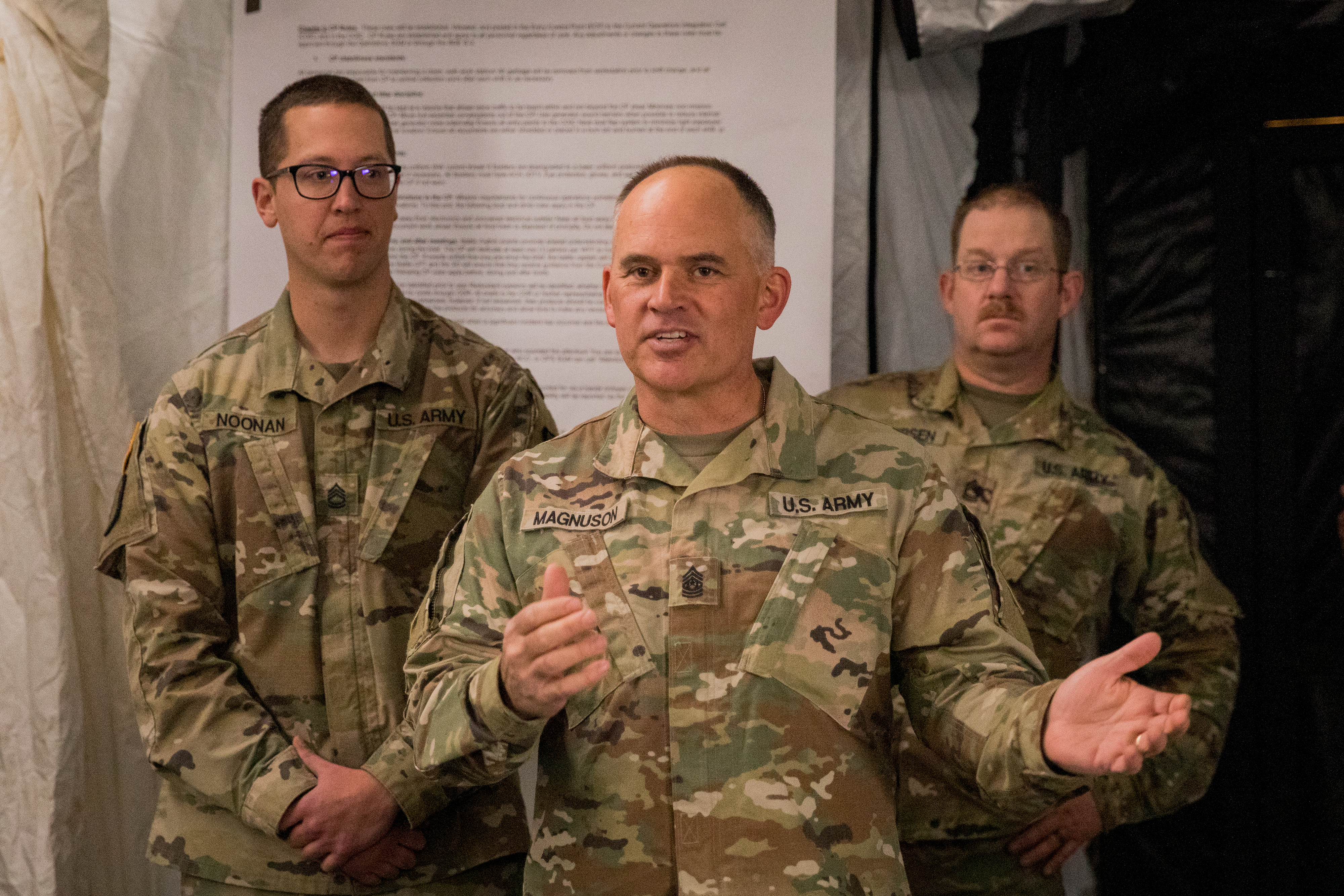 Command Sgt. Maj. Jason Magnuson, N.D. National Guard's senior enlisted leader, addresses Soldiers of the 141st Maneuver Enhancement Brigade during the unit's Warfighter exercise, Camp Atterbury, Indiana, Nov. 2, 2022.