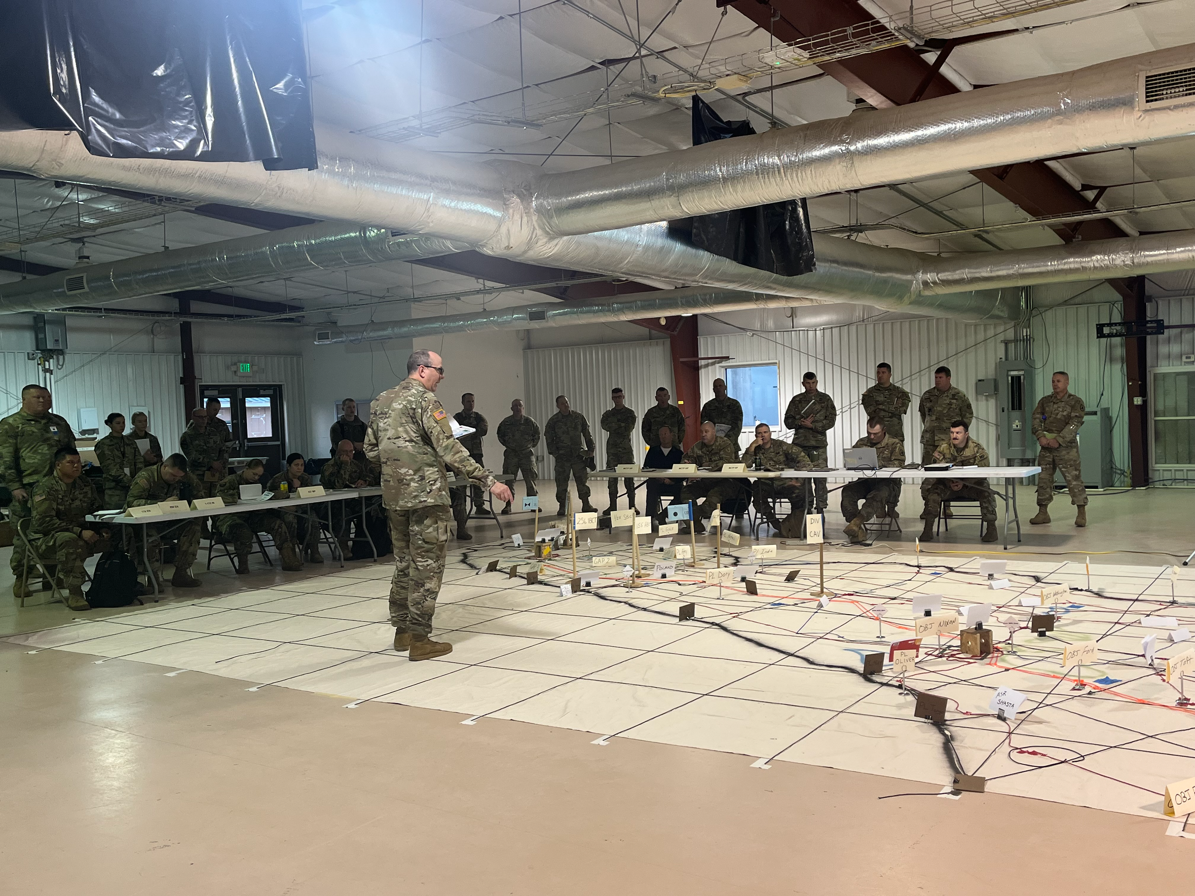 Soldiers from the 141st Maneuver Enhancement Brigade conduct an operations order brief to subordinate commands during an evaluated Warfighter exercise at Camp Atterbury, Indiana, Nov. 2, 2022. (National Guard story and photos by Maj. Rachael Berg, 141st Maneuver Enhancement Brigade)
