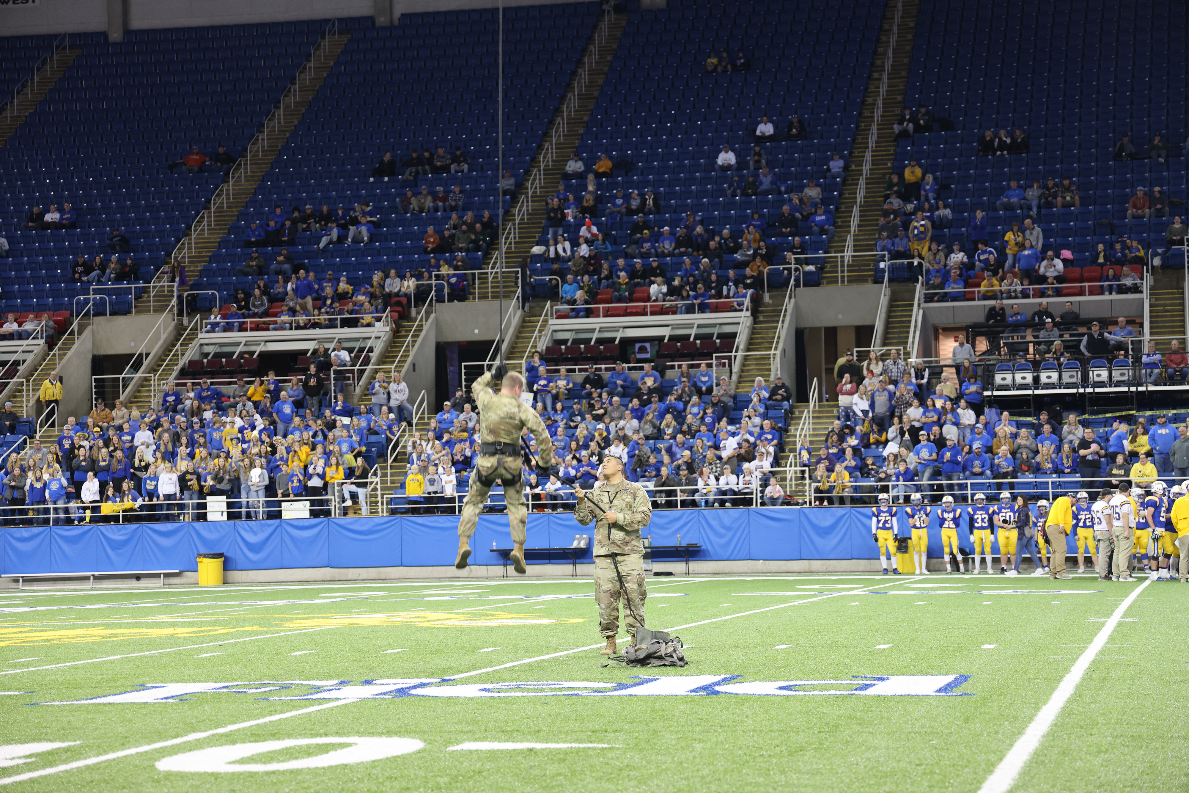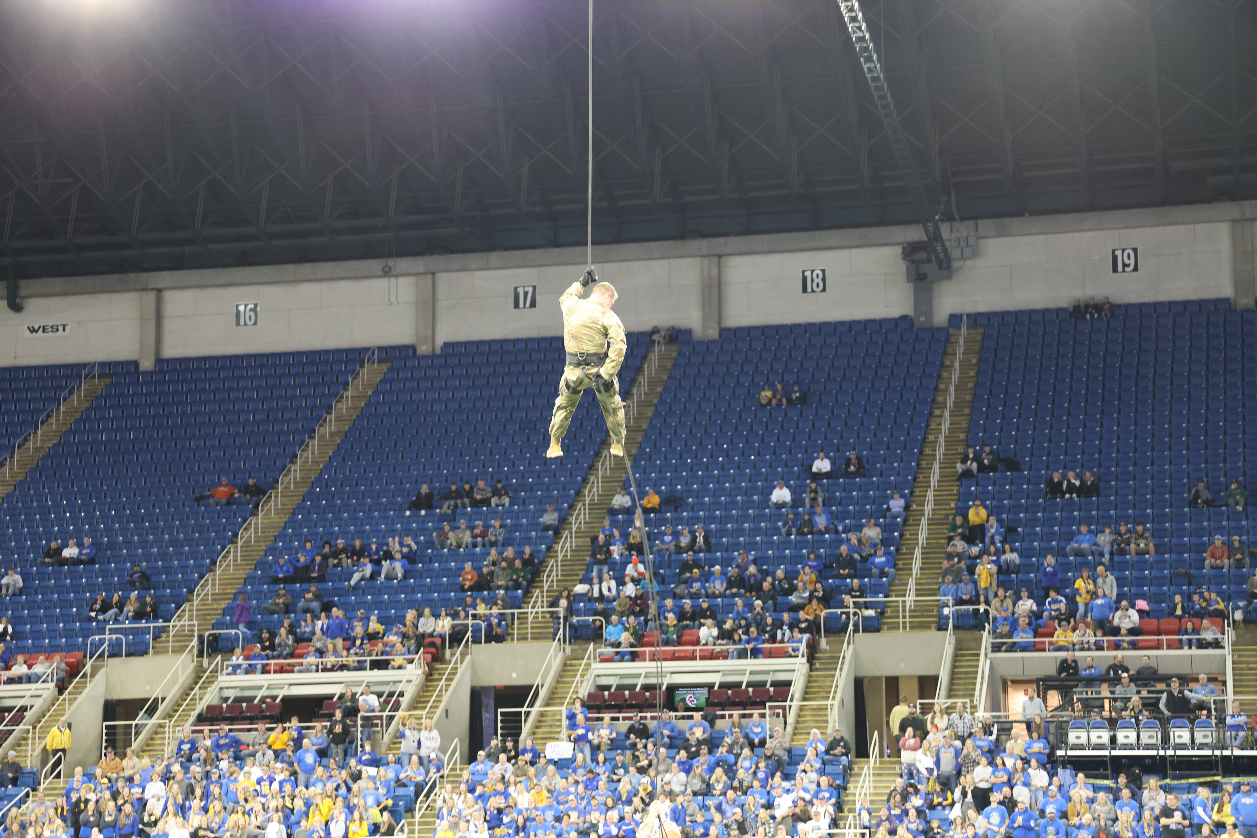 Members of the N.D. Army National Guard Recruiting and Retention Battalion along with the Master Rappel team from the 164th Regional Training Institute supported Dakota Bowl activities at the FargoDome, Fargo, Nov. 11, 2022. (National Guard story and photos by Lt. Col. Nicolette Daschendorf, commander, N.D. Army National Guard Recruiting and Retention Battalion)