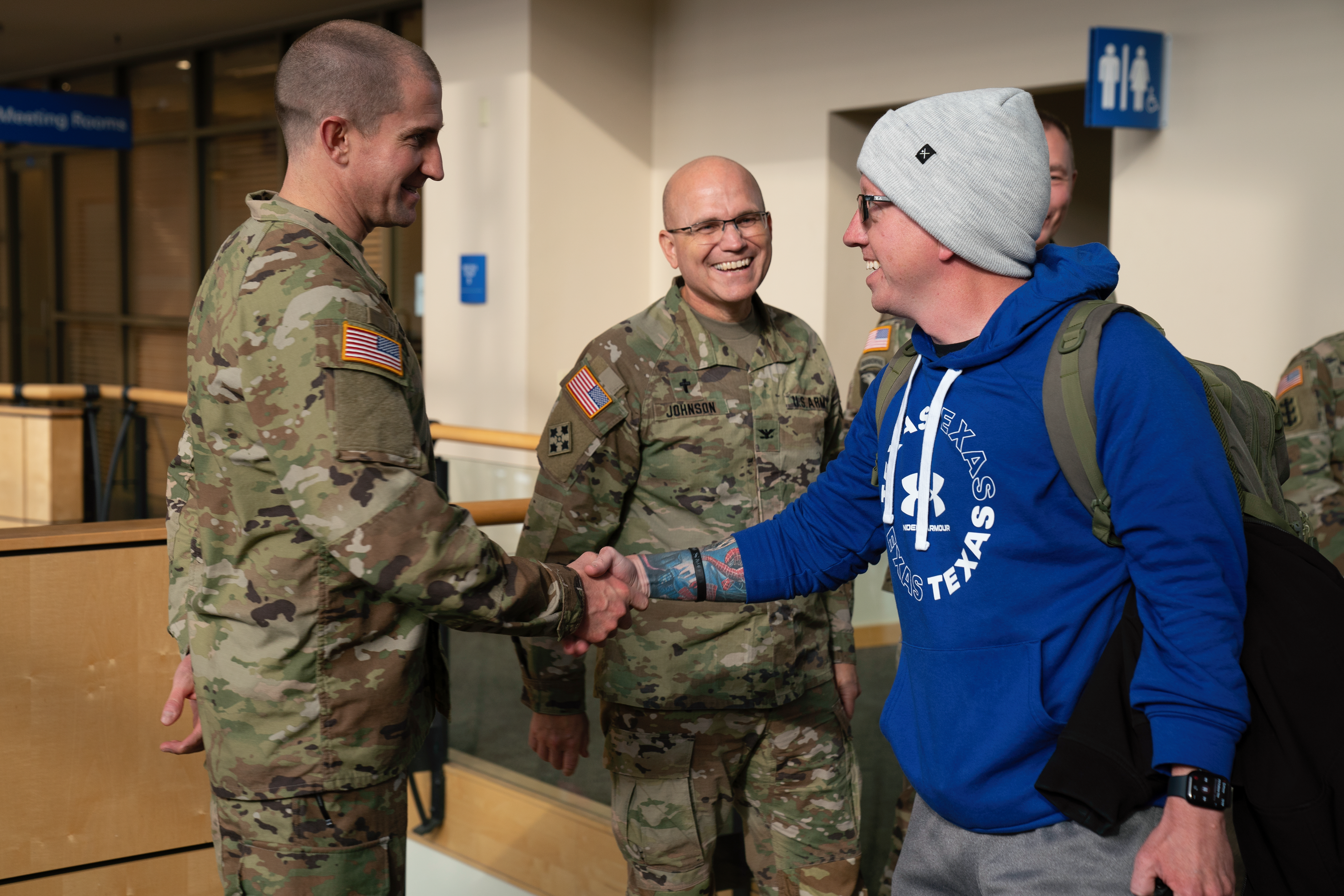 Lt. Col. Matt Voeller, officer-in-charge, 68th Troop Command, greets Sgt. Christopher Geck, 957th Engineer Company (Multi-role Bridge) at the Bismarck Municipal Airport on Nov. 15, 2022, Bismarck, N.D. Several Soldiers returned on commercial airlines. (National Guard photo by Capt. Vanessa Lennick, N.D. National Guard Visual Information)