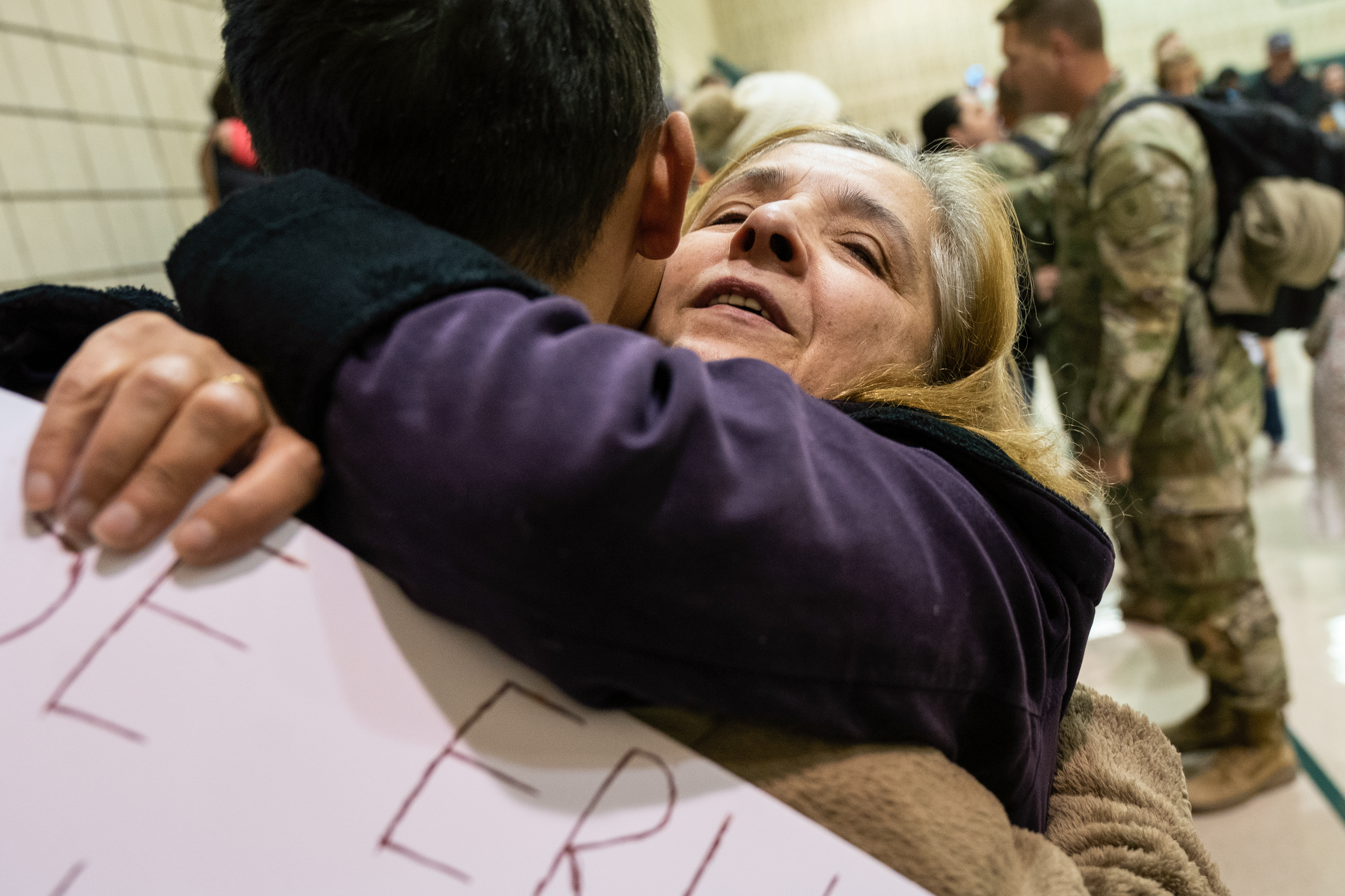 Above: Sgt. Casey Bosch, 957th Engineer Company (Multi-role Bridge), is greeted by his Family at the North Dakota Guard Army Aviation Support Facility, Nov. 15, 2022, Bismarck, N.D. Bosch returned after a year-long mission at the southwest border. (National Guard photo by Capt. Vanessa Lennick, N.D. National Guard Visual Information)