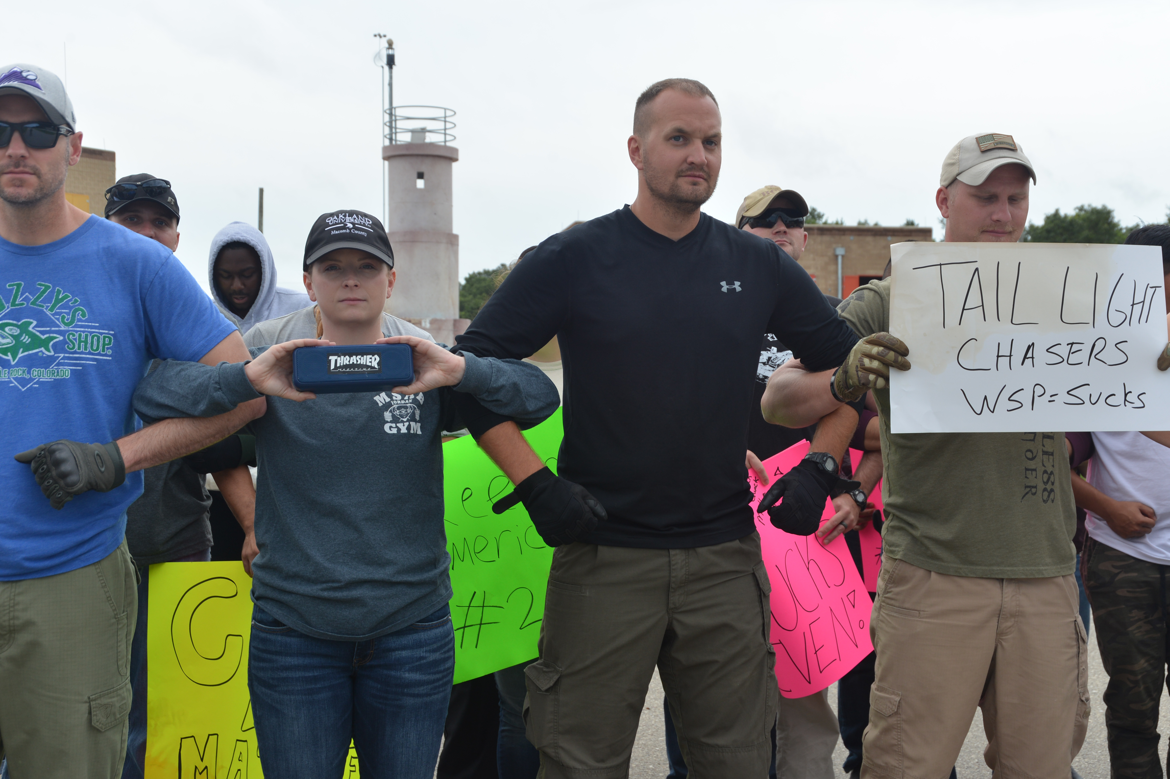 Right photo: Master Sgt. Andrew Frovarp (center), 119th Security Forces Squadron, participated at Patriot North 19 as an antagonist in several simulated crowd control scenarios. This simulated unrest allowed Security Forces Airmen and members of the Wisconsin State Patrol to practice crowd control tactics against unruly groups of citizens who were agitated at the government's slow response to a simulated natural disaster situation.